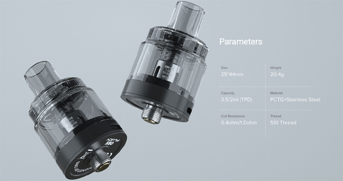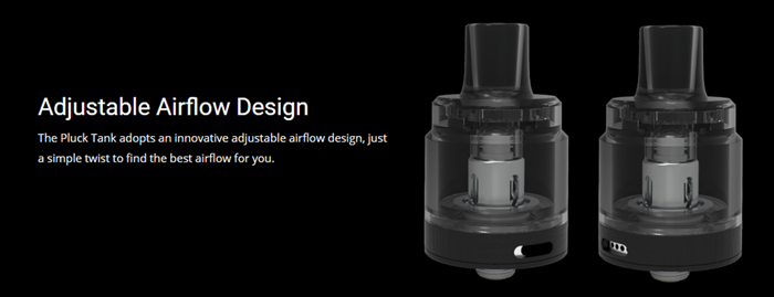 Une bague de circulation d'air réglable est fourni sur la base du réservoir avec de petits trous pour la restriction MTL et une grande fente pour le vapotage DTL.