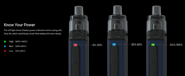 Le mod Pluck est une appareil assez simple sans écran du tout, un simple indicateur LED change de couleur pour afficher la charge restante de la batterie.