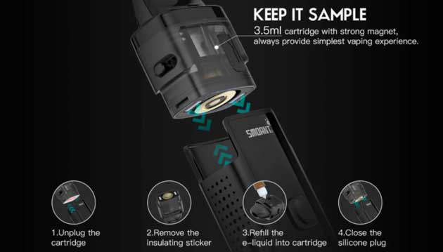 Mais tout ce que nous avons mentionné n’est pas le seul aspect unique du Santi. Vous voyez, il dispose également d'un système de contrôle du flux d'air sur le pod qui peut être réglé pour diriger le poumon, le poumon direct restreint ou le vapotage de type bouche à poumon. Le pod Santi peut également stocker jusqu'à 3,5 ml d'e-liquide et dispose d'un port de jus à remplissage latéral avec un bouchon pour plus de convivialité. Deux aimants puissants sur la cartouche garantissent qu'elle reste en place.