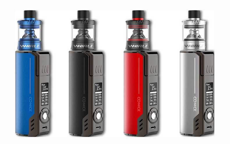 Bien que très peu de choses aient été publiées concernant le Box Mod Conick qui est inclus dans le kit Whirl II, ce que nous savons, c'est qu'il fonctionne avec trois types de batteries différentes, dont un accu 21700 qui devrait permettre un plus long temp de vapotage à la puissance maximale de 100 watts. Cependant, si vous utilisez un accu 18650 plus petite, vous devrez insérer l'étui de batterie incluse dans la baie de batterie qui est accessible par un couvercle rabattable en bas. Un système de charge micro USB de 2 ampères situé au bas de la face de contrôle permet une recharge rapide et vous trouverez un câble compatible dans l'emballage.