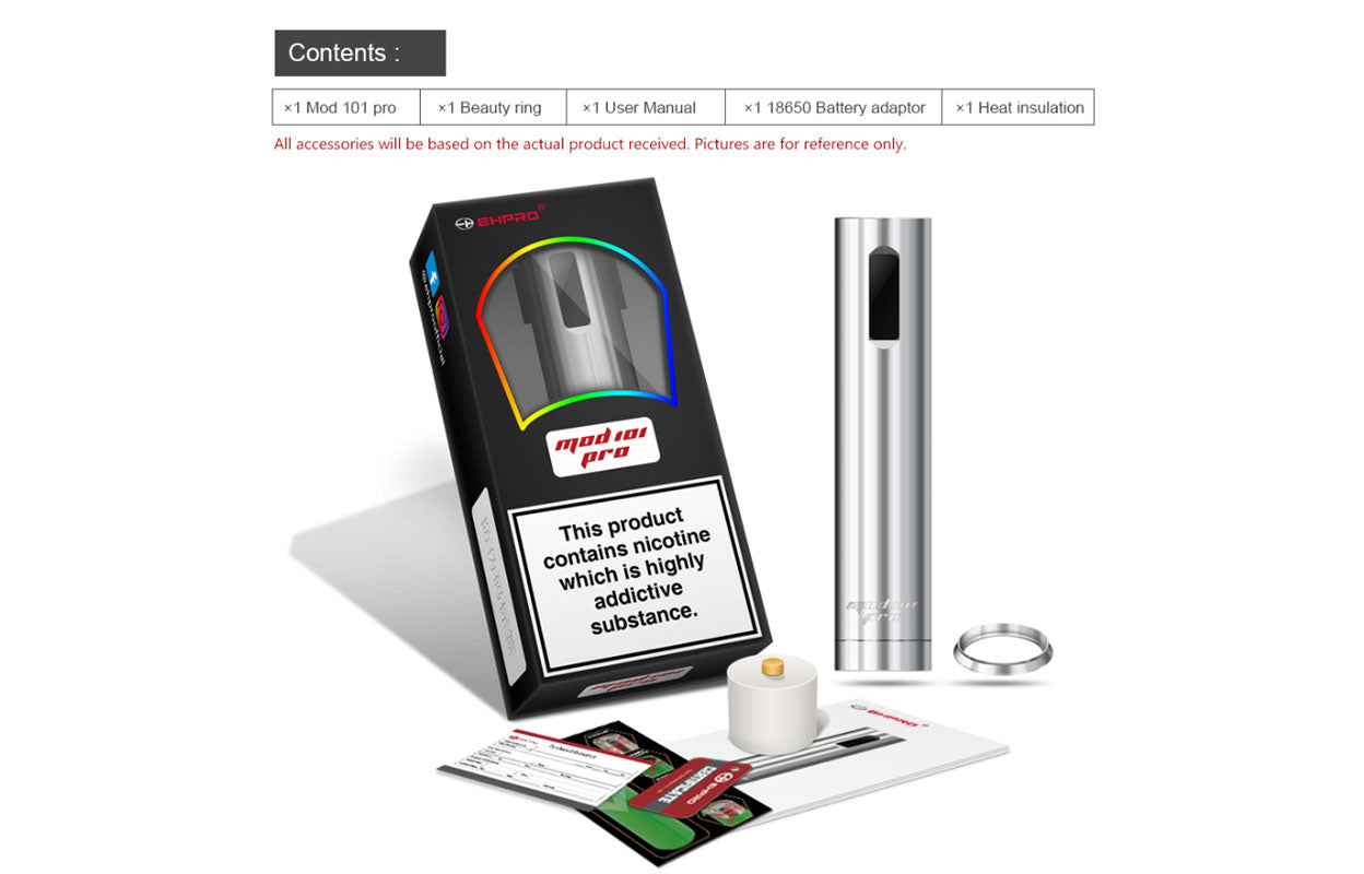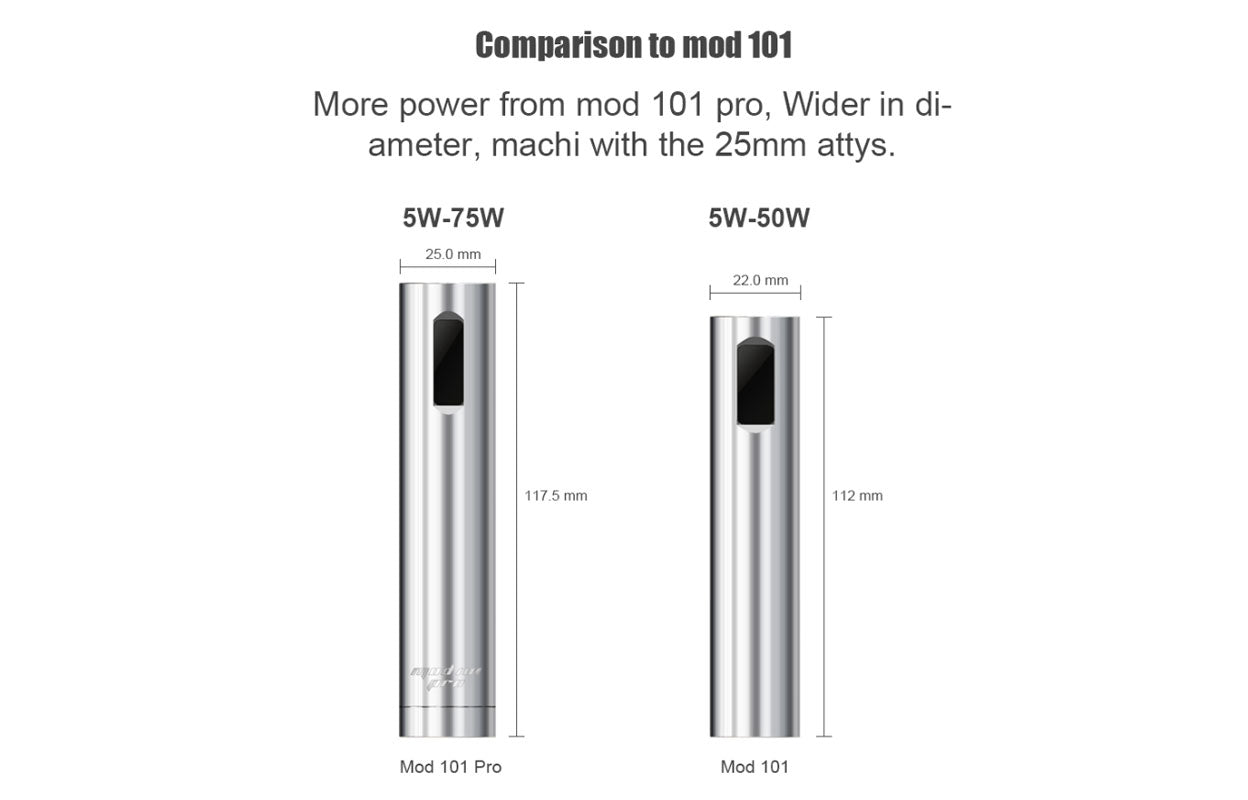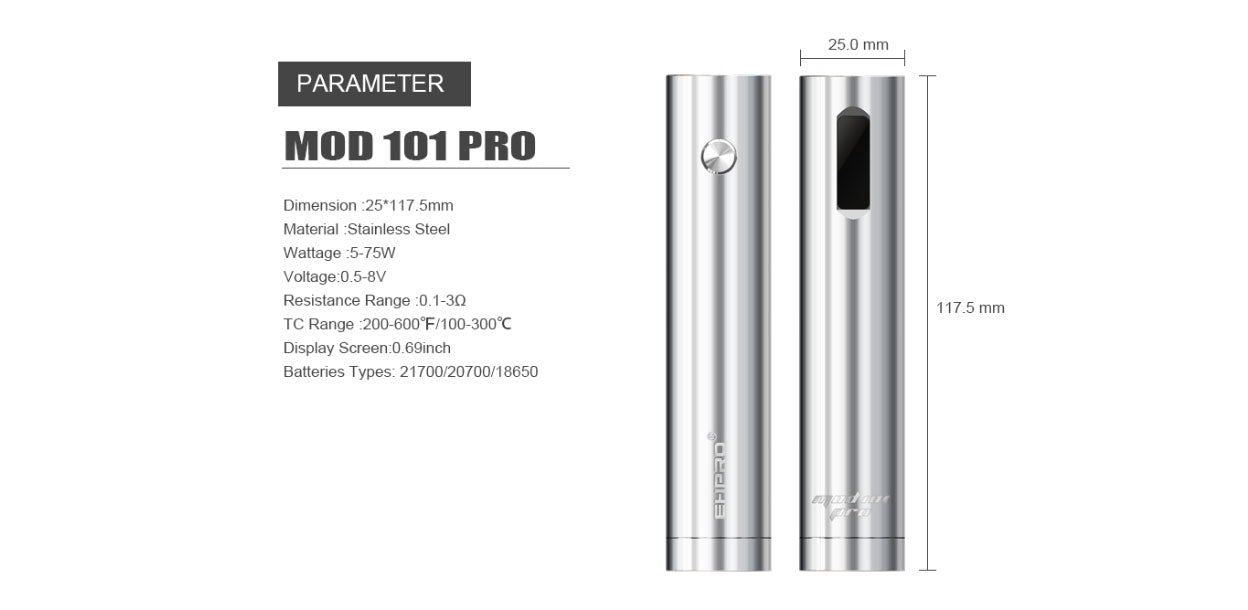 L'Ehpro 101 Mod est un TC Mod assez exquis avec une structure compacte et un design de style stylo. Alimenté par une seule batterie 18650 ou 18350, il peut tirer jusqu'à la puissance maximale de 50 W et prendre en charge le mode VW / TC stable. Avec la conception conviviale d'un bouton et l'écran OLED de 0,49 pouce, il serait très facile à utiliser.