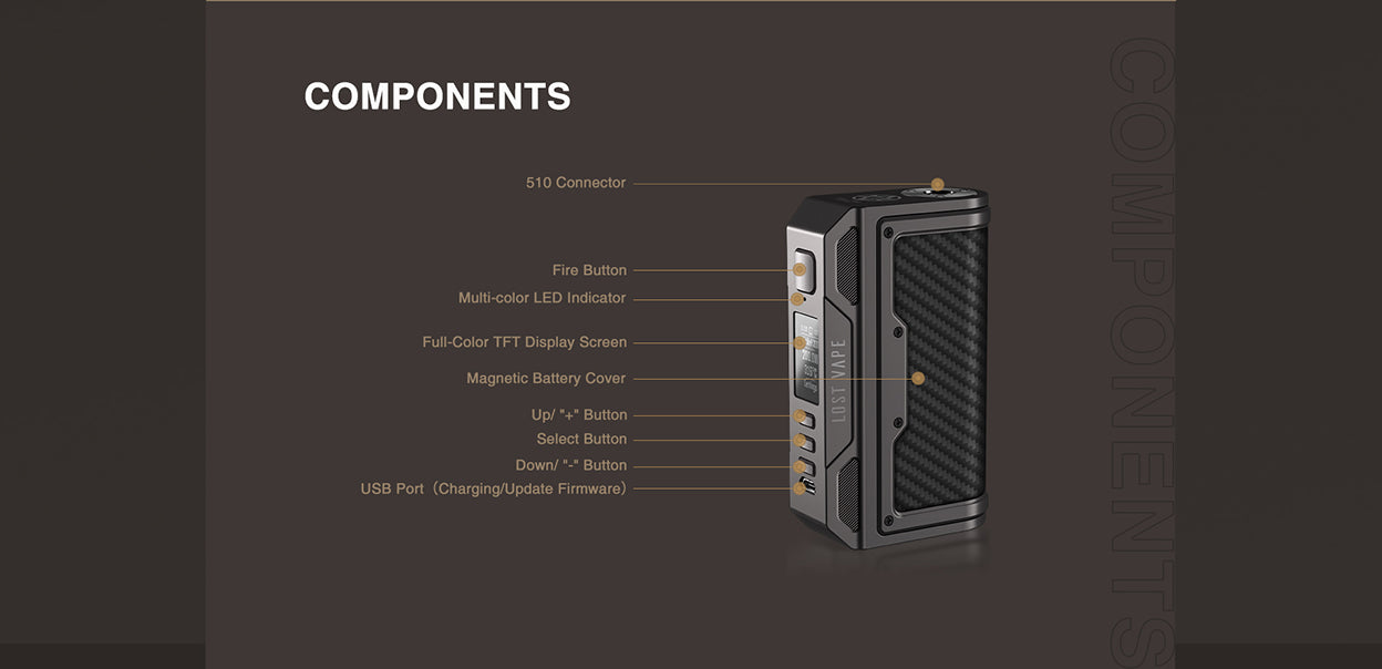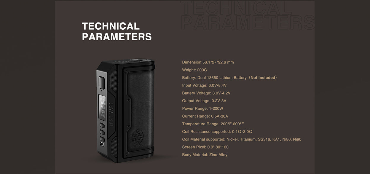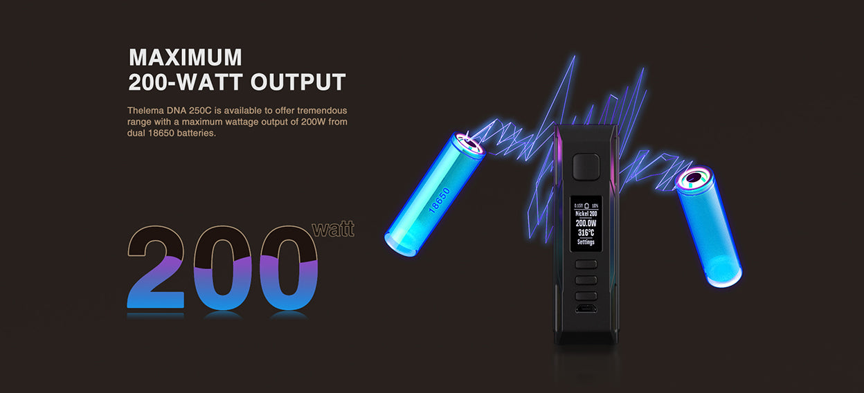 Le Box Mod THELEMA DNA250C - Lost Vape, qui comprend le chipset DNA250C, une gamme de 1 à 200 W et des baies de batteries interchangeables pour la personnalisation. Construit en alliage de zinc de qualité, le THELEMA DNA250C Mod offre une double baie de batterie 18650 à haut ampérage, parfaite pour maintenir le plafond de 200W lorsqu'elle est utilisée toute la journée. Les batteries étant vendues séparément, le THELEMA DNA250C Mod peut utiliser des châssis de batterie interchangeables pour permettre la personnalisation de l'extérieur. Doté du chipset DNA250C, le THELEMA Mod a accès aux modes VW, TC et Bypass, offrant des performances satisfaisantes à l'utilisateur grâce à une sortie de vapeur adaptée.