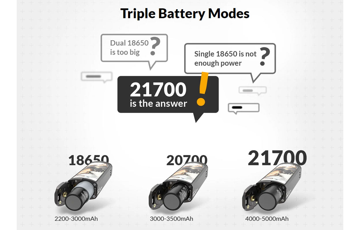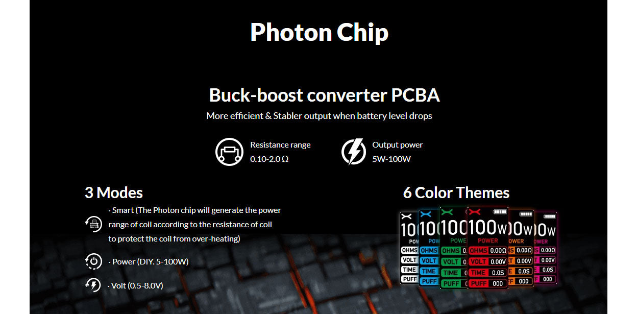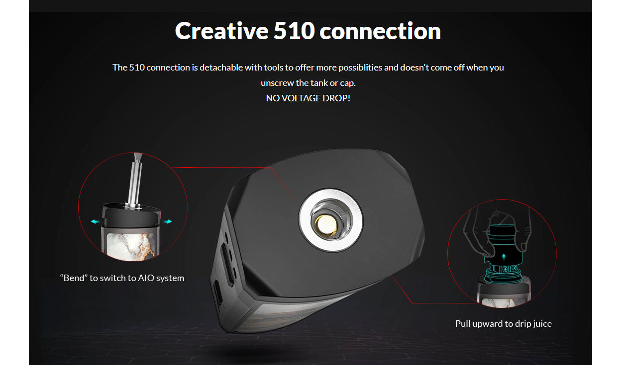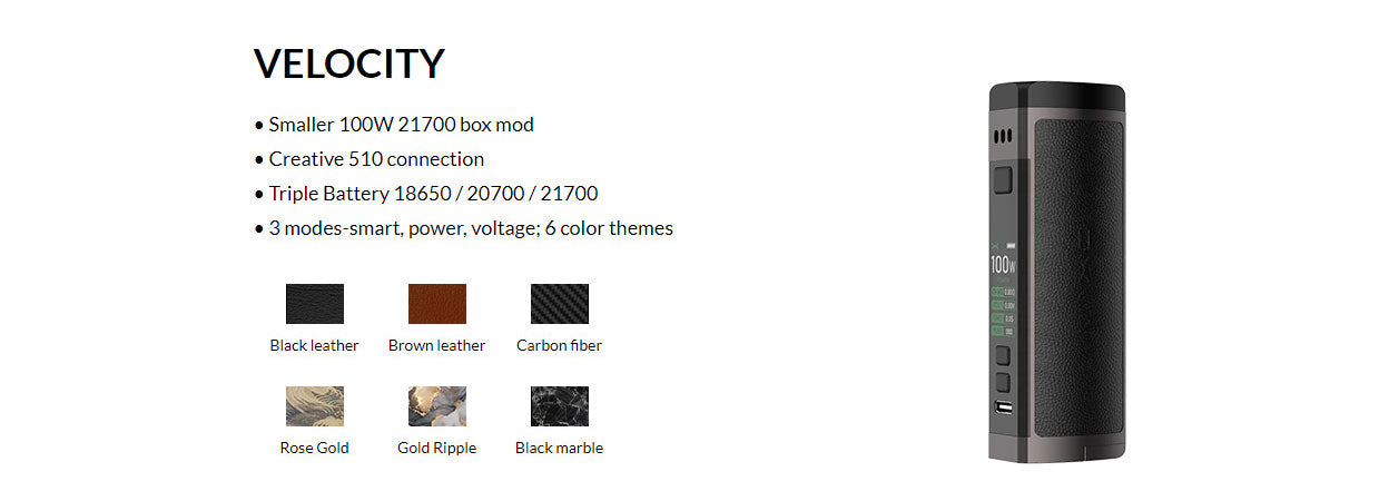 Le Velocity Box Mod est alimenté par une seule batterie 18650/20700/21700 avec une sortie maximale de 100 W. Il est facturé par le port Type-C. Après avoir utilisé le connecteur unique 510, l'OXVA Velocity Mod peut parfaitement passer du mod box au mod pod. Vous pouvez utiliser n'importe quel réservoir 510 dessus et fonctionne parfaitement.