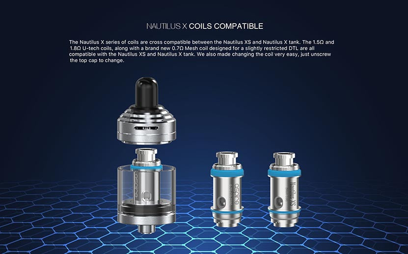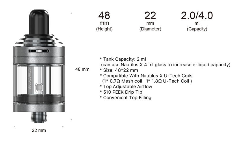 Bobine incluse: Bobine de maille Nautilus XS 0.7Ω et bobine U-Tech Nautilus X 1.8Ω
