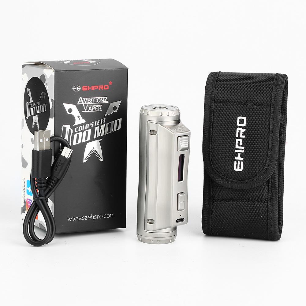 Ehpro Cold Steel 100 Mod est un mod box super puissant et portable co-conçu avec AmbitionZ VapeR, un critique Youtube célèbre et professionnel des États-Unis. Avec sa construction entièrement métallique et sa conception ultra ergonomique, le Cold Steel 100 est durable à utiliser avec une sensation de main fantastique. Il est largement compatible avec une seule batterie 21700/20700/18650 et prend en charge une sortie maximale de 120 W avec une vitesse de tir ultra-rapide de 0,0018S et des modes de fonctionnement PWR / TEMP / CURVE / VOLT / BYPASS haute performance. Associé au port micro-USB pratique pour le chargement et la mise à niveau, le mod Ehpro Cold Steel 100 est définitivement un appareil de vape idéal pour un vapotage quotidien facile.