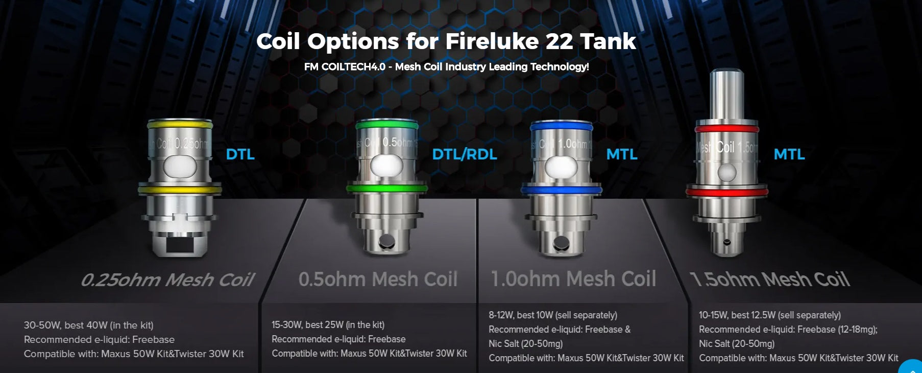 Bobines compatibles: Bobine de maille 0,25ohm pour DTL - 30-50W, meilleur 40W (dans le kit), e-liquide recommandé: Bobine de maille Freebase 0,5ohm pour DTL / RDL - 15-30W, meilleur 25W (dans le kit), recommandé e-liquide: Freebase 1.0ohm Mesh Coil pour MTL - 8-12W, meilleur 10W (vendu séparément), e-liquide recommandé: Freebase & Nic Salt (20-50mg) 1.5ohm Mesh Coil pour MTL - 10-15W, meilleur 12.5 W (vendu séparément), e-liquide recommandé: Freebase (12-18 mg) et Nic Salt (20-50 mg)