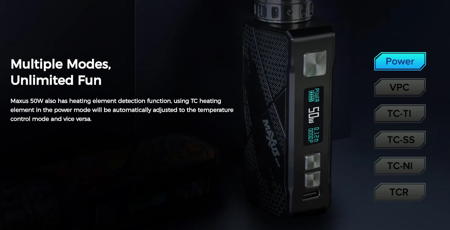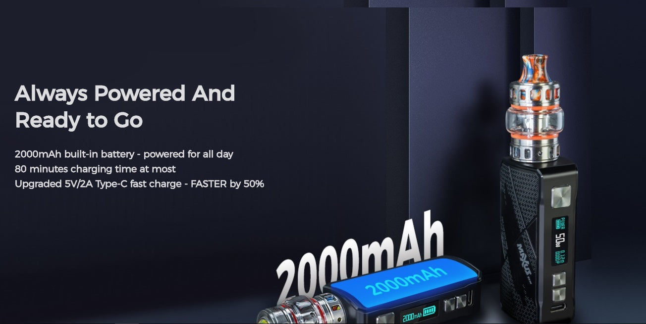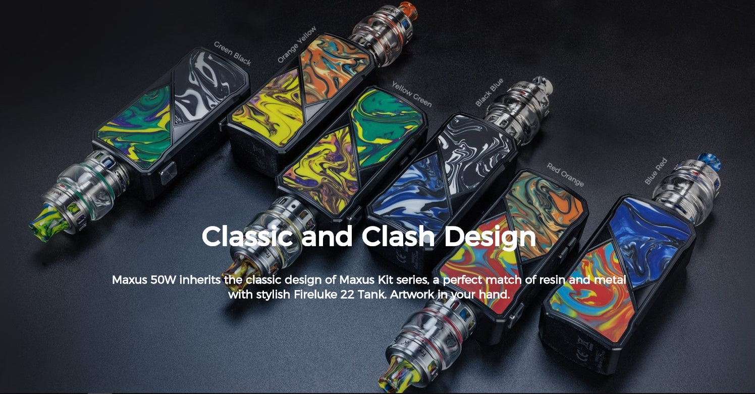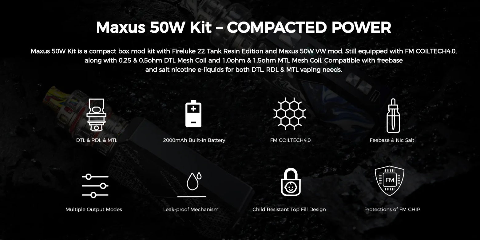 Le kit de démarrage FreeMax Maxus 50W comprend le mod Maxus 50W VW et le réservoir Fireluke 22. Il hérite du design classique de la série Maxus Kit. La résine et le métal s'accordent parfaitement avec le débardeur à la mode Fireluke 22. Petit, coloré, robuste et durable. Le kit Maxus 50W supprime la disposition des batteries de remplacement externes et est équipé d'une batterie intégrée de 2000 mAh pour une alimentation toute la journée. Vous pouvez utiliser une connexion USB Type-C moderne pour charger rapidement la batterie avec un courant de charge 2A amélioré. Le temps de charge est de 80 minutes pour charger complètement l'appareil. Le chipset FM Chip-Maxus 1.0 propriétaire intégré prend en charge plusieurs mesures de protection de sécurité, fournit jusqu'à 50 watts de puissance de sortie et offre une vitesse de tir ultra-rapide. Le kit Maxus 50W offre une commutation de mode de sortie multiple, y compris Power, VPC (Variable Power Control), Bypass, TC-TI (Temperature Control Titanium), TC-NI (Temperature Control Nickel), TC-SS (Temperature Control Stainless Steel) et TCR (coefficient de température de résistance). L'interface de fonctionnement du système classique à trois boutons est très facile à utiliser et le grand écran facile à lire affiche les données de vapotage de manière claire et complète. Fireluke 22 Tank Resin Edition est fabriqué en acier inoxydable de haute qualité avec un motif de résine proéminent, peut contenir jusqu'à 3,5 ml d'e-liquide et dispose d'une méthode de remplissage supérieure améliorée. Soulevez et faites simplement glisser le couvercle supérieur pour le remplir, super facile et pratique. Cette conception élimine le risque que les enfants entrent en contact avec le e-liquide. Fireluke 22 Tank dispose également d'un mécanisme étanche, même lorsque le réservoir est rempli d'e-liquide, il prend également en charge le remplacement de la résistance. Lorsque la bobine est tirée, le trou d'alimentation en e-liquide se ferme automatiquement. Fireluke 22 Tank Resin Edition utilise également la technologie améliorée FM CoilTech 4.0, compatible avec les bobines de maille DTL 0,25 et 0,5 ohm (incluses) et les bobines de maille MTL de 1,0 ohm et 1,5 ohm (vendues séparément). Que vous utilisiez la version DL ou la version MTL, que vous souhaitiez utiliser une base libre ordinaire ou de la nic salée, tout peut fonctionner normalement et assurer une expérience de vapotage satisfaisante. La soupape de débit d'air réglable à double fente au bas du réservoir vous permet d'ajuster le débit d'air pour obtenir un impact de gorge idéal.