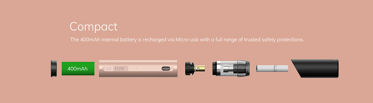 OInnokin EQ FLTR est un appareil spécialement conçu pour les fumeurs qui souhaitent arrêter de fumer. Cet appareil facile à utiliser possède un filtre semblable à une cig. Innokin EQ FLTR est un système de pod, c'est donc une cig très simple, même un débutant complet peut l'utiliser. Le filtre souple rappelle les cig de tabac classiques, donc une sensation en bouche familière vous attend sans fumée nocive lorsque vous vapotez. La capacité de la batterie intégrée est de 400 mAh, ce qui garantit une alimentation stable et un vapotage confortable. Il peut être chargé rapidement et facilement via le port micro USB et est également équipé d'un indicateur LED pour la puissance restante. Il existe également une série de mesures de protection pratiques pour assurer une atomisation sans problème et sûre. La puissance réalisable est de 9,5 W, ce qui est très approprié pour la sortie optimale d'une bobine de 1,2 ohm. Le kit EQ FLTR étant équipé d'un système de tirage automatique pratique, il peut être atomisé sans appuyer sur le bouton. Tout ce que vous avez à faire est de tirer de l'embout buccal et la vapeur commencera à se former immédiatement.