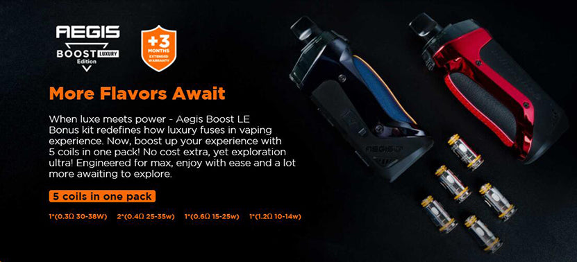 Le kit bonus Geekvape Aegis Boost LE est la version luxueuse du kit original Aegis Boost 40W avec 5 bobines de la série Geekvape B. Il est construit avec une batterie de 1500mAh avec une sortie maximale de 40W. Avec la construction d'alliage de zinc, de cuir de première qualité et de silicone de qualité alimentaire, il est résistant aux taches, aux déchirures et à l'eau. De plus, le kit bonus Aegis Boost LE peut prendre en charge Pod ou RDTA et fournir un vapotage MTL ou DTL. Il a une capacité de 3,7 ml de jus électronique et est livré avec un système de remplissage facile. Le kit bonus Aegis Boost LE est conçu pour un maximum de confort et de facilité.Il est donc livré avec des conceptions innovantes: conception de soupape de débit d'air facile d'accès, conception de dosette de remplissage supérieure à accès facile, conception de verrouillage et de libération rapides. Puisse-t-il vous offrir un vapotage incroyable!