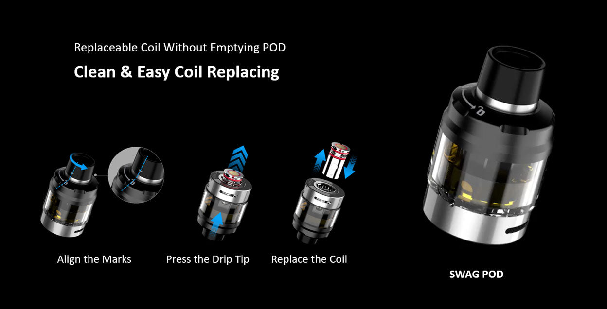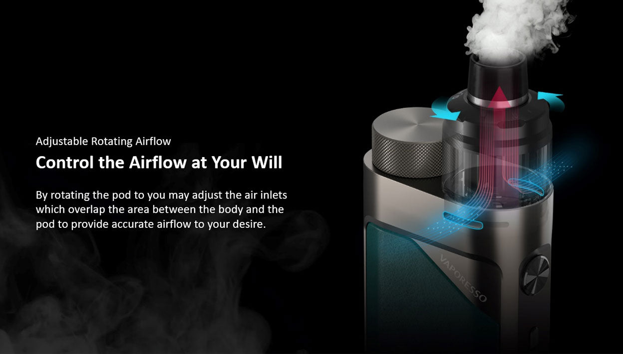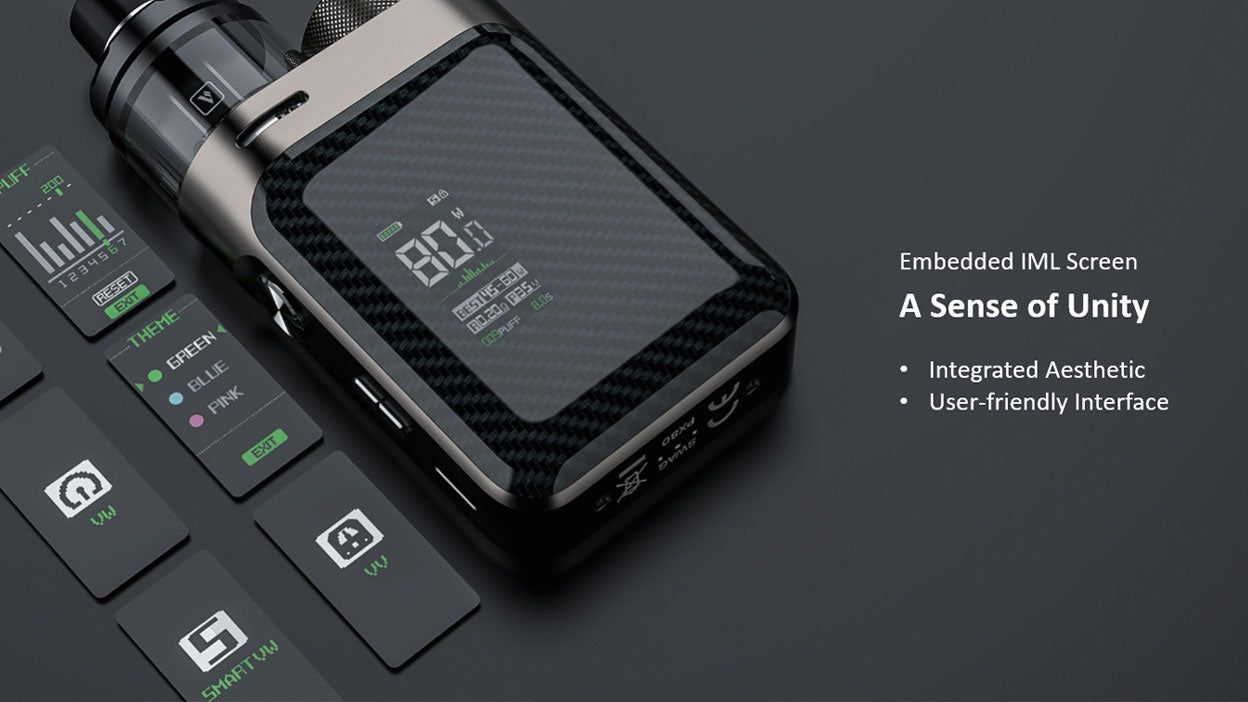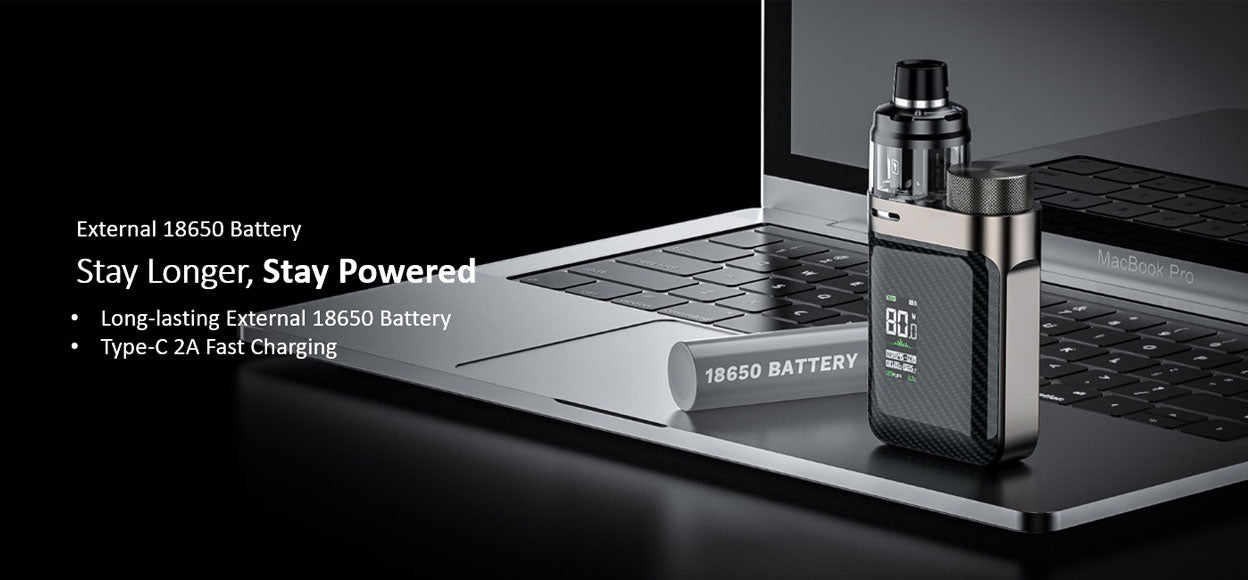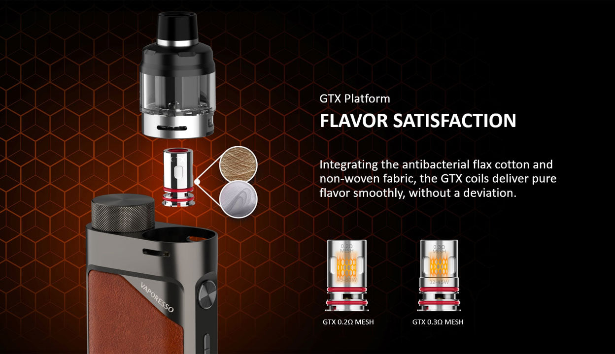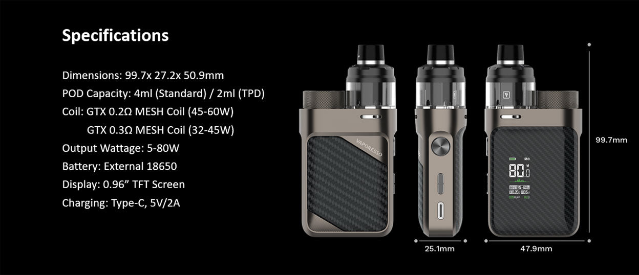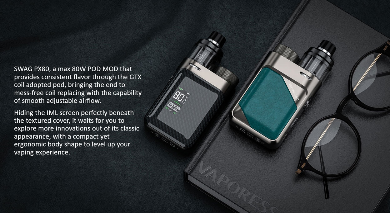 Vaporesso SWAG PX80, un POD MOD de 80W maximum qui fournit une saveur constante grâce à la bobine GTX adoptée par le pod, mettant fin au remplacement des serpentins sans salissures grâce à la capcité de régler le débit d'air de façon stable. Cachant parfaitement l'écran IML sous le couvercle texturé, il vous attend pour explorer d'autres innovations de son apparence classique, avec une forme de corps compacte mais ergonomique pour vous permettre de profiter pleinement du vapotage. Il intègre le chipset AXON avec une vitesse de tir instantanée de 0,001S, une puissance de sortie maximale jusqu'à 80W, une puissance de sortie réglable entre 5W et 80W, supporte les modes de fonctionnement VW, Smart VW et VV pour répondre à vos besoins de vapotage. Alimenté par une seule batterie 18650 pour une longue durée. le Swag PX80 avec l'écran couleur TFT IML 0,96 pouce avec une interface conviviale, 3 couleurs disponibles, vous montrera clairement les données de vapotage. le Swag Pod avec une capacité de 4ml de liquide de jus électronique, avec une conception de flux d'air rotatif réglable, en faisant tourner le pod pour ajuster les entrées d'air qui chevauchent la zone entre le corps et le pod pour fournir un flux d'air