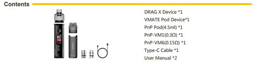 Le kit Drag X & Vmate Pod est le coffret cadeau en édition limitée conçu pour remercier les supporters de Voopoo. Ce coffret cadeau comprend un kit Drag X et un kit Vmate Pod. Le kit Drag X est alimenté par une seule batterie 18650 avec une puissance réglable de 5 à 80 W. Il a une grande capacité de 4,5 ml de jus électronique et dispose d'une plate-forme universelle d'atomiseur PnP. Drag X est conçu avec le système innovant de flux d'air infini qui prend en charge la régulation de toute taille de voie aérienne. De plus, vous pouvez profiter de l'expérience la plus confortable grâce à ce système, quel que soit le type de bobine ou les différents paramètres définis. Quant au kit Vmate Pod. C'est un dispositif de démarrage savoureux et peu coûteux et livré avec une capacité de 3 ml de jus électronique. De plus, Vmate Pod adopte un maillage de 0,7 ohm, ce qui augmentera la zone de chauffage de plus de 3 fois et peut présenter une saveur riche. Vmate Pod dispose également d'un espace de condensat indépendant et unidirectionnel. Avec une charge rapide de type c 5V / 1A et une grande capacité de 900mAh, vous pouvez profiter d'un vapotage de deux jours. Le coffret cadeau VOOPOO Drag X & Vmate Pod est le premier ensemble limité de deux appareils Mod Pod + Pod de l'industrie, qui satisfera tout ce que vous voulez, obtenez-le!