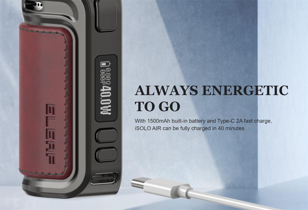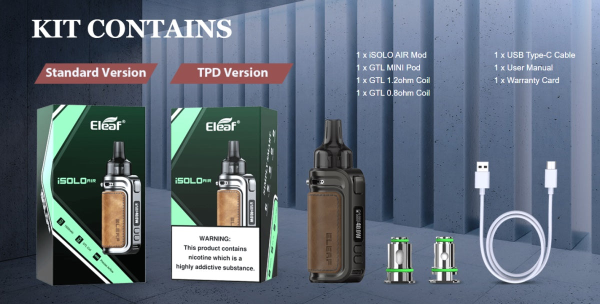 Le Kit iSolo Air - Eleaf est conçu pour être le pod mod le plus adapté à votre main grâce à sa taille compacte et à son design élégant. Alimenté par une batterie intégrée de 1500mAh, il est capable d'une puissance maximale de 40W. La fonction de puissance variable vous permet de contrôler entièrement la production de vapeur pour une expérience plus personnalisée. Le jeu de puces interne assure un fonctionnement régulier, constant et précis de l'appareil, tout en offrant une pléthore de fonctions de sécurité. Près du sommet de l'Eleaf iSolo Air mod, c'est un système de flux d'air innovant, une valve de flux d'air à double fente réglable qui vous permet de contrôler l'entrée d'air de chaque vapeur. Pour modifier l'airflow, il suffit de pousser le petit bouton sur le côté pour trouver le réglage idéal pour le coup de gorge idéal. Le mini-pod GTL, d'une capacité de 2 ml, est fixé sur le dessus du mod, se remplit par un orifice inférieur et accepte toutes les coils GTL Eleaf. Le Mini pod GTL s'adapte au mod à n'importe quelle rotation. Les aimants placés sur le fond du pod se connectent bien à la plaque métallique circulaire à l'intérieur du module. Il est compatible avec la série de bobines GTL pour le vapotage DL (l'inhalation directe) et MTL (l'inalation indirecte). Le pod utilise également une méthode d'installation des bobines par pression qui permet un changement rapide et facile des bobines. Le Mini Pod GTL peut également être associé à une base à 510 et transformé en réservoir GTL Mini Pod pour être utilisé sur la majorité des modèles de vapotage.