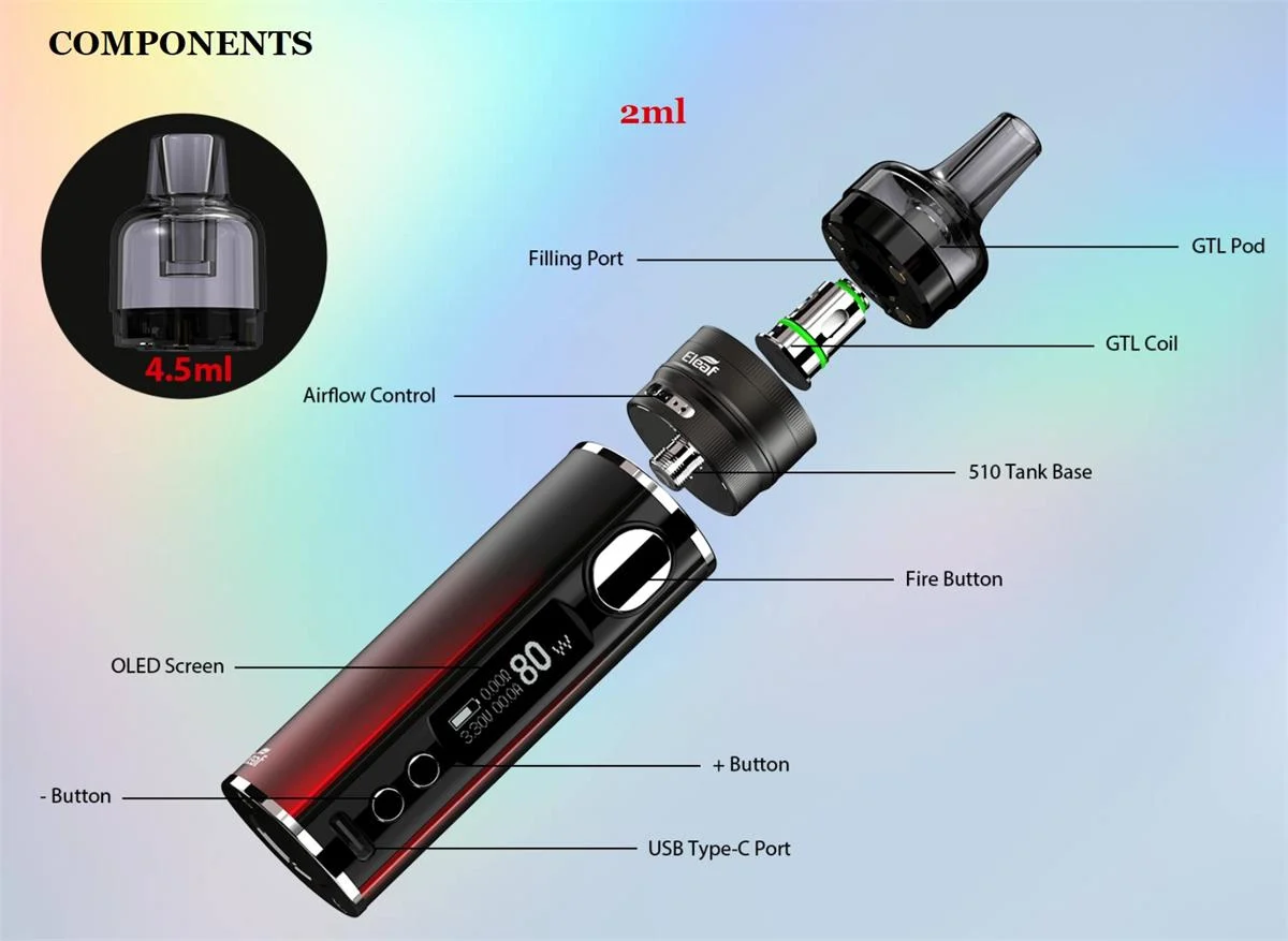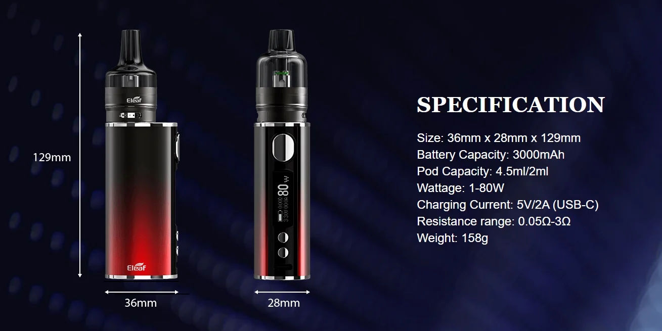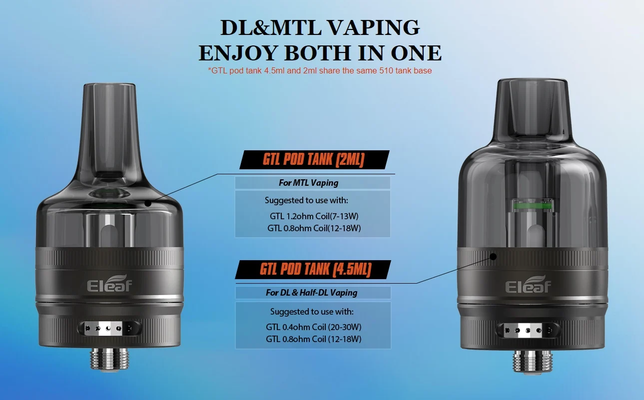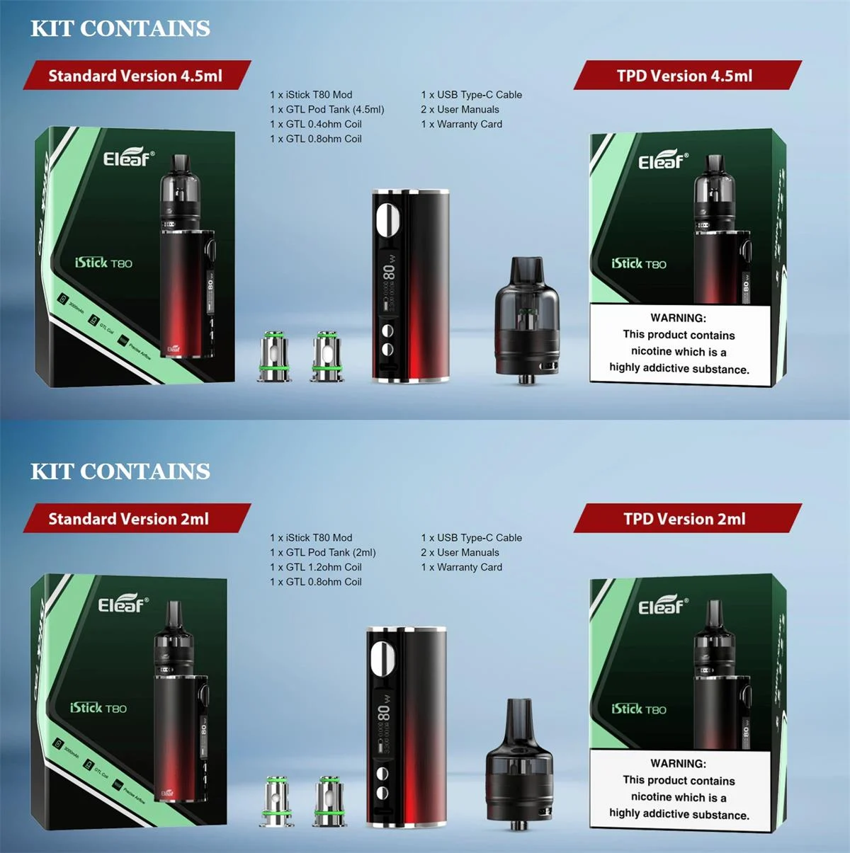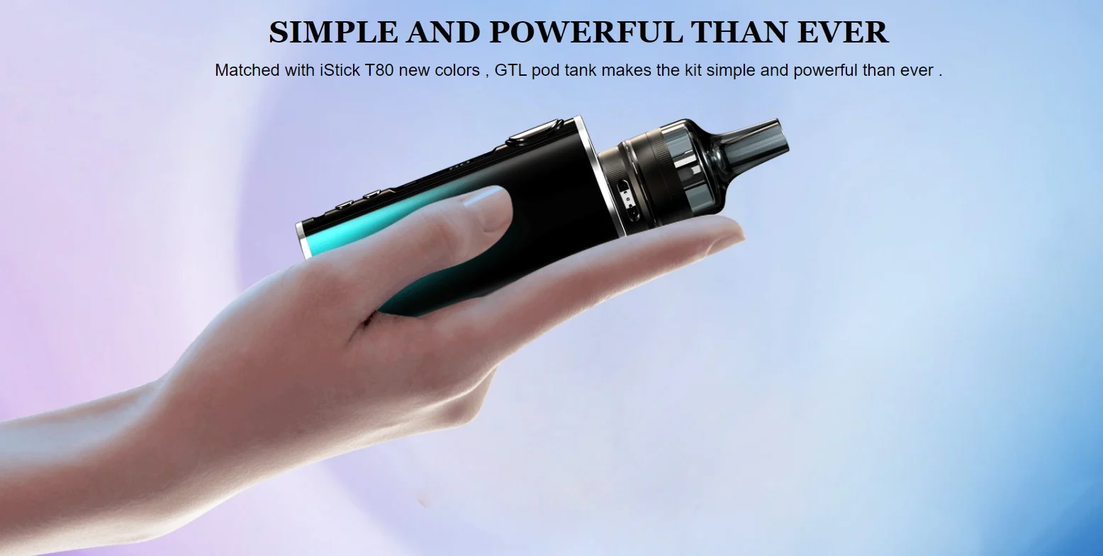 Le kit Eleaf iStick T80 avec réservoir GTL Pod présente un kit de démarrage multifonction composé d'un nouveau mod iStick T80 couleur et d'un réservoir de pod GTL avec une base de filetage 510. La batterie Eleaf iStick T80 est livrée avec une grande batterie intégrée de 3000 mAh qui peut offrir une puissance réglable de 1 à 80 W. Avec la charge rapide Type-C 2A, vous pouvez charger l'appareil plus facilement et plus rapidement. Il suffit de déplacer le pod GTL vers un réservoir avec la base à filetage 510. La connexion magnétique rend le remplissage et le changement de bobine plus faciles que jamais. Pris en charge par les bobines GTL, le réservoir à dosettes GTL satisfait à la fois le vapotage MTL et DL avec les versions 2 ml et 4,5 ml. De plus, le réservoir à dosettes GTL applique un contrôle du flux d'air sur les deux côtés, chaque côté avec un gros et cinq petits trous, garantissant des ajustements libres entre l'entrée d'air maximale et extrême restreinte. L'iStick T80 est livré avec de nouvelles couleurs et un nouveau réservoir de pod GTL. Procurez-vous simplement le nouvel appareil Eleaf iStick T80 et profitez du goût incroyable.