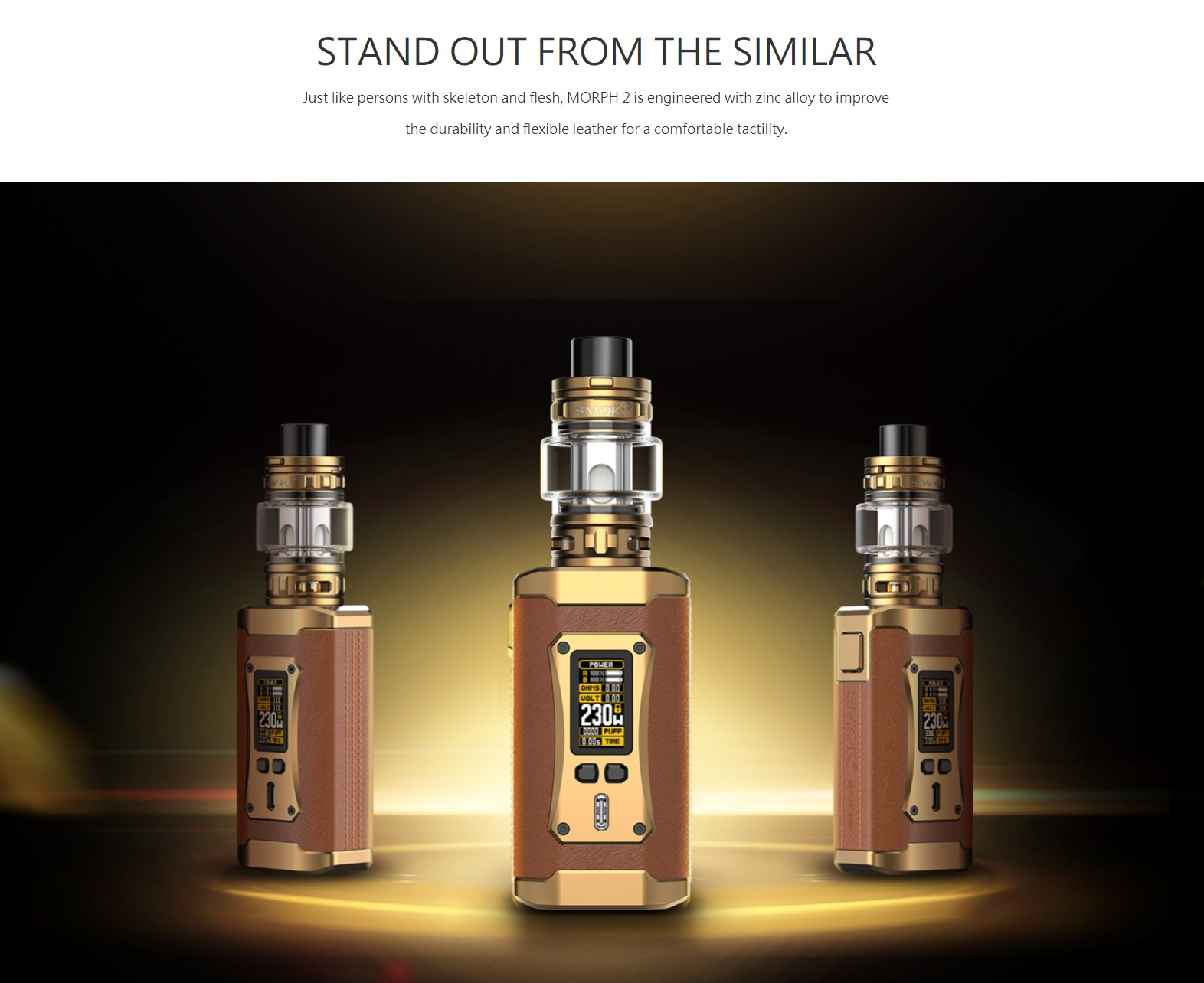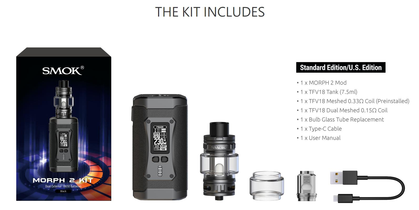 Le kit Smok Morph 2 est une version mise à jour de son prédécesseur, le kit Morph 219. Ce kit est composé d'un mod Morph 2 et TFV18 Tank. Morph 2 est conçu avec un alliage de zinc pour améliorer la durabilité, tandis que le cuir souple recouvert sur la surface a un toucher confortable. L'avant est décoré d'un écran de 0,96 pouces, de boutons de commande et d'un port de chargement, et le bouton de tir a été placé sur le côté. SMOK Morph 2 utilise deux batteries 18650 pour fonctionner. La double batterie 18650 a une autonomie double et une puissance suffisante, créant les conditions pour un vapotage immersif. Grâce au port USB Type-C, vous pouvez exécuter une charge équilibrée à une vitesse maximale de 2,0 A à l'intérieur du mod, ce qui non seulement prolonge la durée de vie de la batterie, mais raccourcit également le temps de charge. Morph 2 est équipé d'une puce IQ-S qui fournit non seulement un temps de déclenchement très rapide de 0,001 seconde, mais fournit également des fonctions pratiques telles que la protection par mot de passe et des modes de sortie personnalisables (Power / TC) pour prendre en charge différents styles de vape. Le tout nouveau réservoir TFV18 Sub-ohm est connecté au SMOK Morph 2 Mod via un fil 510. Bénéficiant d'une capacité colossale de jus électronique de 7,5 ml, le TFV18 vous permet de vapoter toute la journée sans pratiquement aucun remplissage. En haut se trouve un drip tip en résine et un petit bouton pour révéler l'orifice de remplissage. Appuyez simplement sur le bouton et poussez la partie supérieure sur le côté pour commencer à charger votre réservoir TFV18 avec votre e-liquide préféré. Le réservoir SMOK TFV18 est compatible avec les nouvelles bobines maillées remplaçables: une bobine maillée TFV18 de 0,33 ohm et une bobine maillée double TFV18 de 0,15 ohm. Les deux têtes de bobine d'atomiseur sont équipées d'une structure en maille, qui peut fournir une grande surface, produire un goût prononcé et apporter le meilleur effet de génération de vapeur. Ces deux résistances sont incluses dans le kit. Le réservoir TFV16 Sub-Ohm promu la base de l'atomiseur et dispose d'un anneau de contrôle du flux d'air inférieur pour améliorer la section transversale du flux d'air. La résistance au tirage peut être ajustée en continu d'un tirage DL limité à un tirage entièrement ouvert.