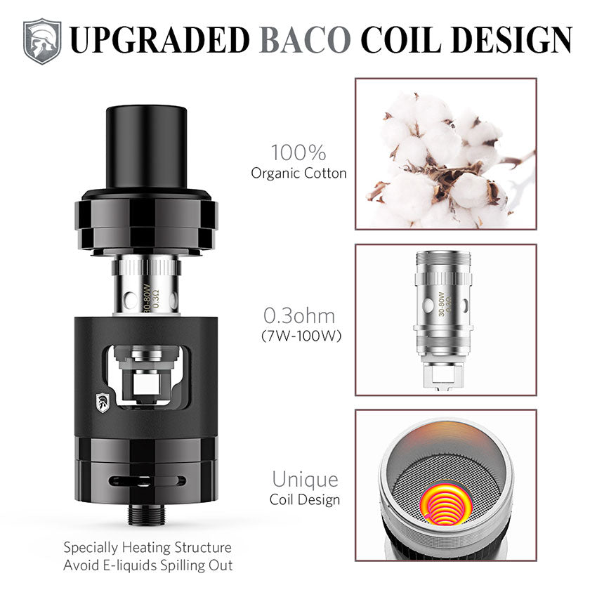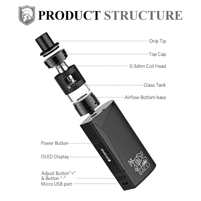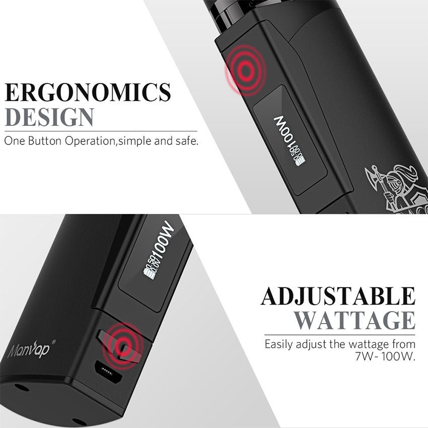 Kit Mod Manvape MP Baco 100W 2000mAh. Value Vape box mod kit de démarrage super puissance jusqu'à 100W, vous donne intelligemment la possibilité d'obtenir différents réglages de puissance de vapotage que vous souhaitez. Le contour incurvé ergonomique vous offre une meilleure adhérence et une meilleure tenue. Kit de vapotage de sortie intégré d'une capacité de 2000 mAh à 100 W, donne des saveurs riches totalement pures. Le réservoir étanche amélioré à remplissage par le haut rend le remplissage aussi simple que possible. Notre kit de vapotage de cig à vapeur est strictement conforme à la norme EU TPD. Ensemble de kit de démarrage e cig assez portable et compact, s'adapte parfaitement à votre main ou à votre poche. Meilleur pour toutes les occasions élégantes que vous aimez.