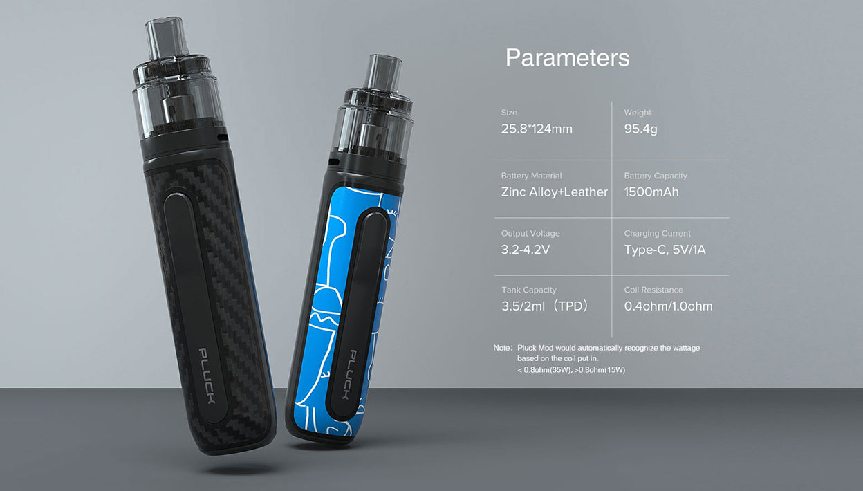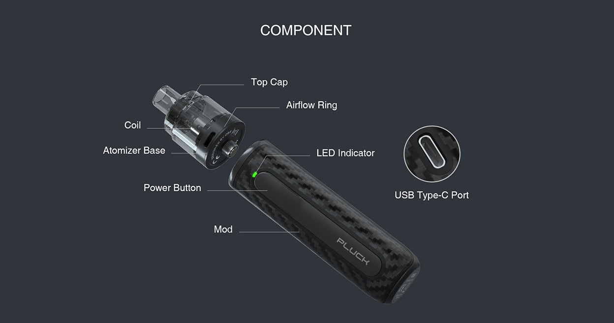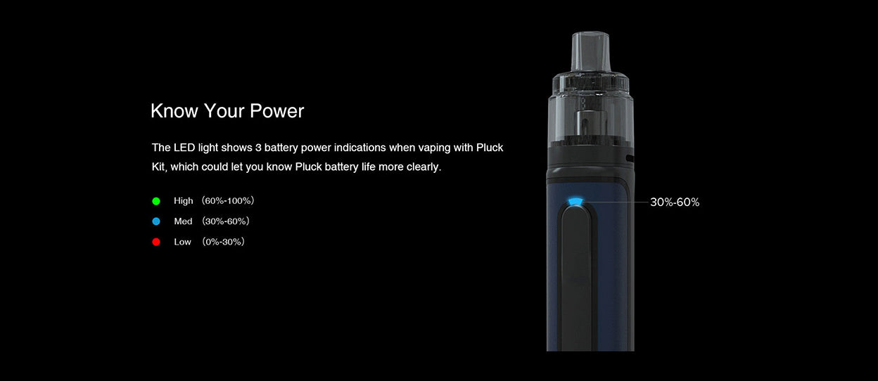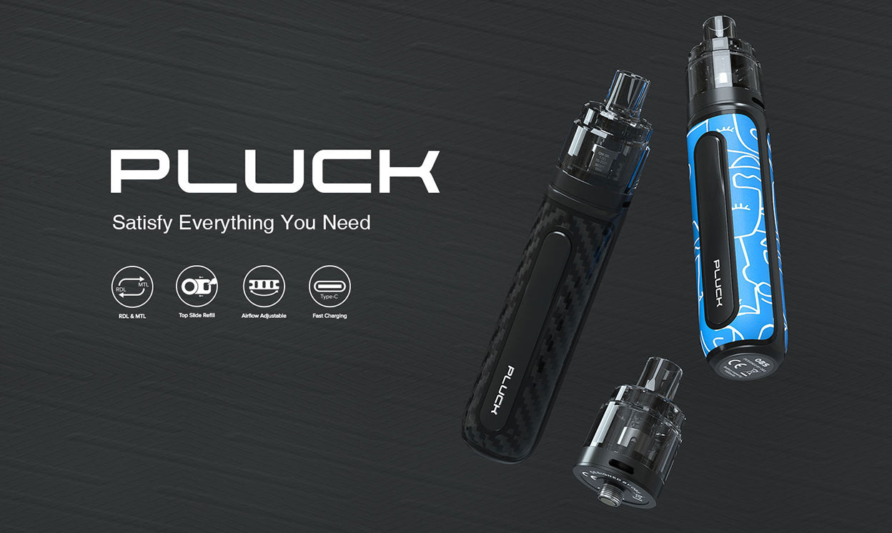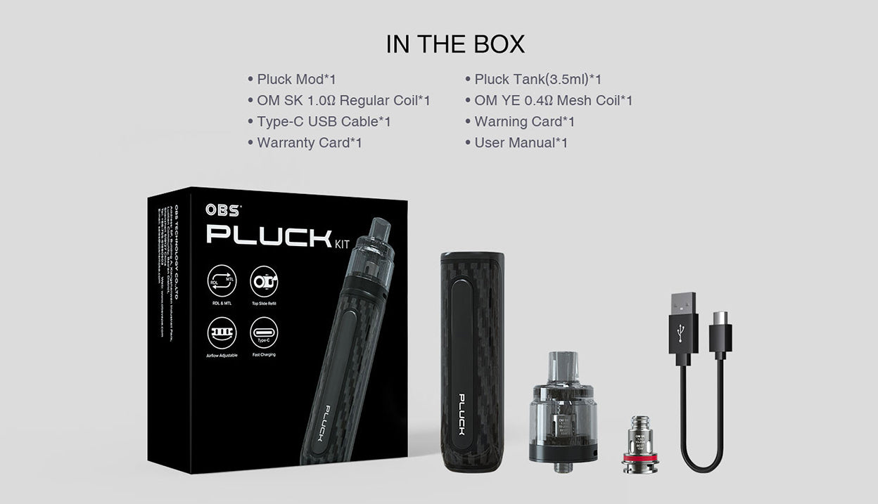 OBS Pluck Kit est un petit kit de démarrage intelligent avec un mod compact et un réservoir sans entretien, adapté au vapotage MTL et RDL. Construit en alliage de zinc et en cuir durables, le kit OBS Pluck adopte une conception de cylindre ergonomique qui favorise une prise ferme à chaque fois que vous vapotez. Le kit Pluck a un panneau de commande simple et le bouton de tir de style long occupe tout le devant. Sur sa partie supérieure, il y a un petit indicateur LED. La lumière LED montre 3 indications de puissance de la batterie lors de la vaporisation avec Pluck Kit, ce qui pourrait vous permettre de connaître plus clairement la durée de vie de la batterie Pluck. Le Pluck est alimenté par une batterie interne de 1500mAh que vous pouvez charger rapidement grâce à la capacité de charge rapide 5V / 1A de l'appareil via le port de charge USB Type-C. Sur le dessus du mod se trouve un réservoir de 3,5 ml, composé d'une cartouche de dosette transparente et d'une base atomiseur 510 avec un anneau d'air. Le réservoir Pluck est connecté au mod via le connecteur 510. Pluck Pod possède un drip tip exclusif intégré, qui peut être glissé d'avant en arrière à travers le système de remplissage supérieur pour exposer l'orifice de remplissage et se fermer fermement. Le kit OBS Pluck comprend deux bobines OM et des remplacements sont facilement disponibles. Parfait pour le vapotage RDL (poumon direct restreint) et MTL (bouche à poumon). Faites pivoter la bague de circulation d'air au bas du réservoir OBS Pluck pour ajuster la quantité de flux d'air pour une inspiration plus serrée ou plus lâche.