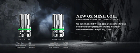 Résistance: GZ 0.2Ω (Kanthal, DL, 45-65W); GZ 0.4Ω (Kanthal, Half-DL, 20-35W)