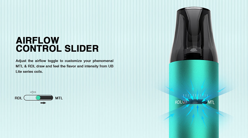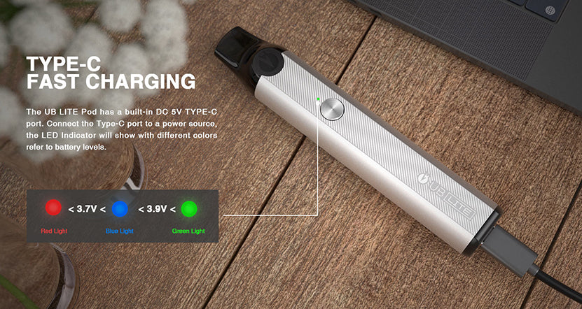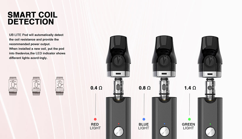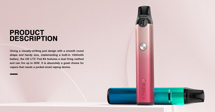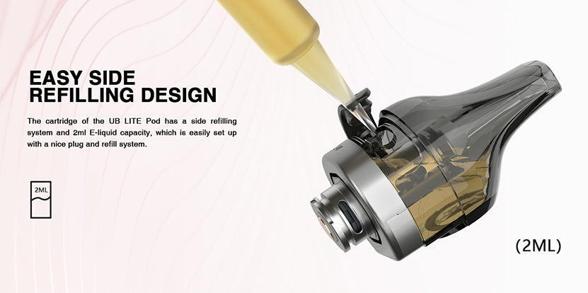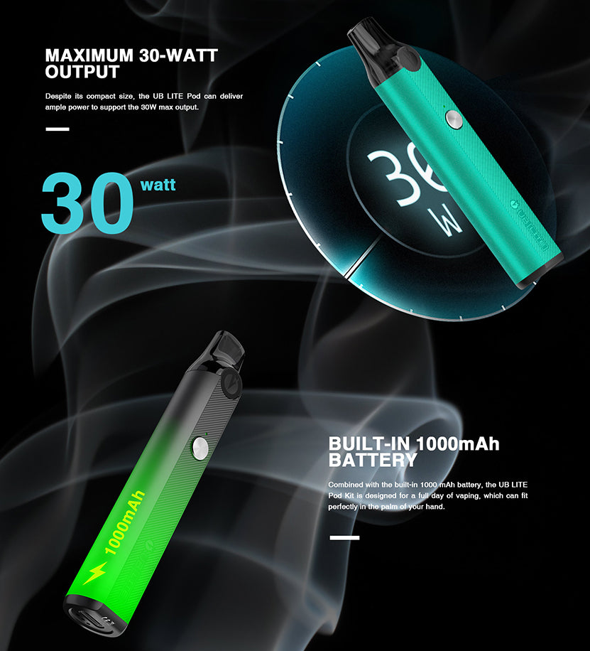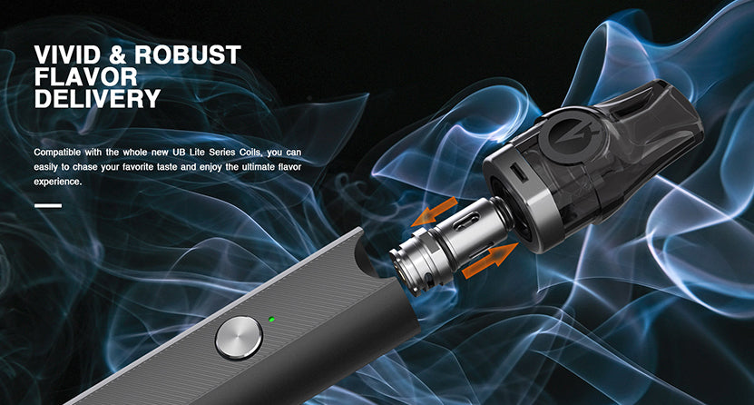 Kit Pod UB Lite - Lost Vape est le tout dernier ciga électroniques de la série Lost Vape Quest. Il offre un design de pod avec un impact visuel, avec une forme ronde lisse et une taille pratique, fabriqué en alliage d'aluminium léger, très léger et mince, et peut être placé avec soin dans n'importe quelle poche, sac à main ou sac d'école. La texture sur le devant de l'appareil augmente la prise du système de pod. Avec une capacité de batterie de 1000mAh - le kit Pod UB Lite donnera à la plupart des vapoteurs une journée entière de vapotage avant d'avoir besoin d'une recharge. L'UB Lite Pod possède un port DC 5V Type-C intégré. Connectez le port Type-C à la source d'alimentation, l'indicateur LED au-dessus du bouton de feu affichera différentes couleurs selon le niveau de la batterie. Le kit UB Lite Pod permet d'activer simultanément le tiroir et le bouton. Pour démarrer l'appareil, vous pouvez appuyer manuellement sur le bouton de tir, ou (en utilisant la fonction de tirage automatique) simplement inhaler sur l'embout buccal et le capteur déclenchera le mécanisme de tir. Malgré sa taille compacte, le kit Pod UB Lite peut fournir suffisamment de puissance pour supporter une puissance maximale de 30W. Comme l'appareil n'a pas d'écran ni de boutons de réglage, la puce détectera automatiquement la résistance installée et ajustera la puissance. Il fournit la puissance de sortie recommandée pour répondre aux besoins. Après avoir installé la nouvelle bobine, placez le pod dans l'appareil, et l'indicateur LED affichera des lumières de couleurs différentes en conséquence. La cartouche du pod UB Lite est dotée d'un système de remplissage latéral et d'une capacité de 2 ml de liquide E. Un côté de la cartouche est le logo de la marque, et l'autre côté est un trou de remplissage avec un bouchon en silicone. Le dessus est un embout intégré plat. Le bas de la cartouche peut recevoir la nouvelle série de résistances UB Lite, offrant une résistance de 0,4 ohms et 1,4 ohms pour le vapotage DTL et MTL. À l'arrière de l'appareil se trouve un curseur de débit d'air qui vous permet de régler le débit d'air entre un réglage restreint direct aux poumons (RDL) et un réglage bouche à poumon (MTL). Ressentez la saveur et l'intensité des résistances de la série UB Lite.
