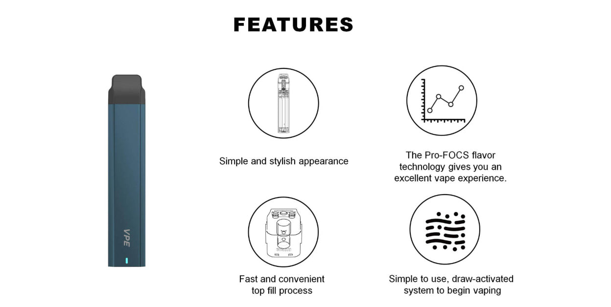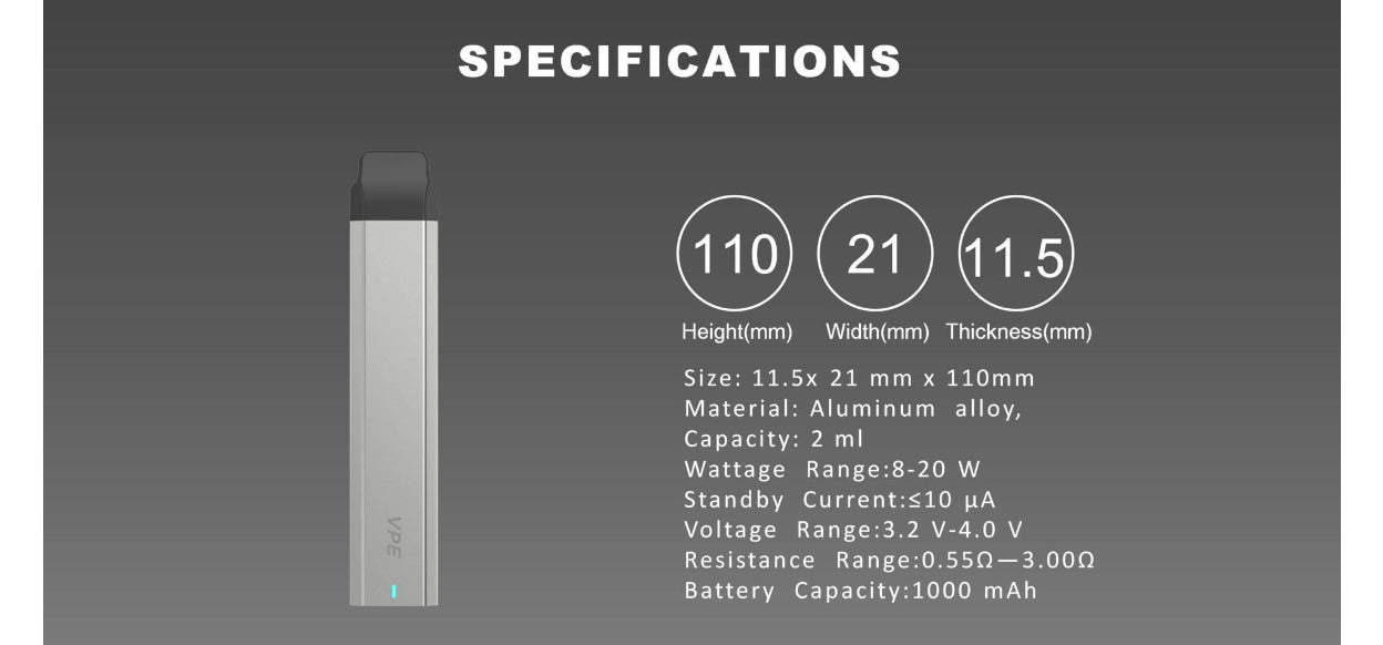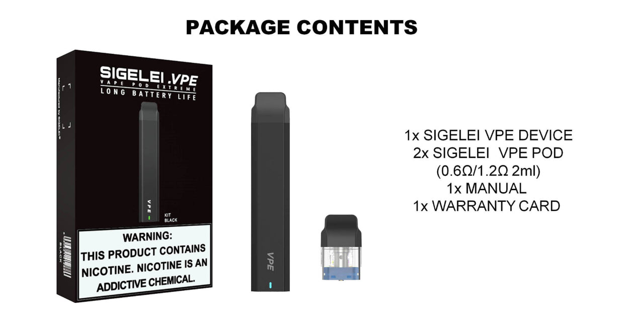 Le Sigelei VPE est un appareil puissant au design compact. Le Pod Sigelei VPE 20w, dispose d'une batterie intégrée de 1000mAh, d'un mécanisme de mise à feu activé par tirage, et est compatible avec 4 types de pods. Construit en alliage d'aluminium durable, le châssis est léger et ne comporte aucun bouton pour empêcher tout tir automatique accidentel. Avec une puissance de sortie de 8 à 20 W, le VPE est parfait pour être utilisé avec les quatre options de pods de résistance. Fonctionnant avec un mécanisme de mise à feu activé par tirage, le système de capsule VPE est parfait pour une utilisation en déplacement et peut contenir jusqu'à 2 ml dans la capsule du haut. Les recharges sont facilitées derrière l'embout buccal qui agit comme un bouchon pour maintenir votre eJuice préféré ou vos sels de nic. Seuls les pods de 0,6 ohm et de 1,2 ohm sont inclus dans le paquet.