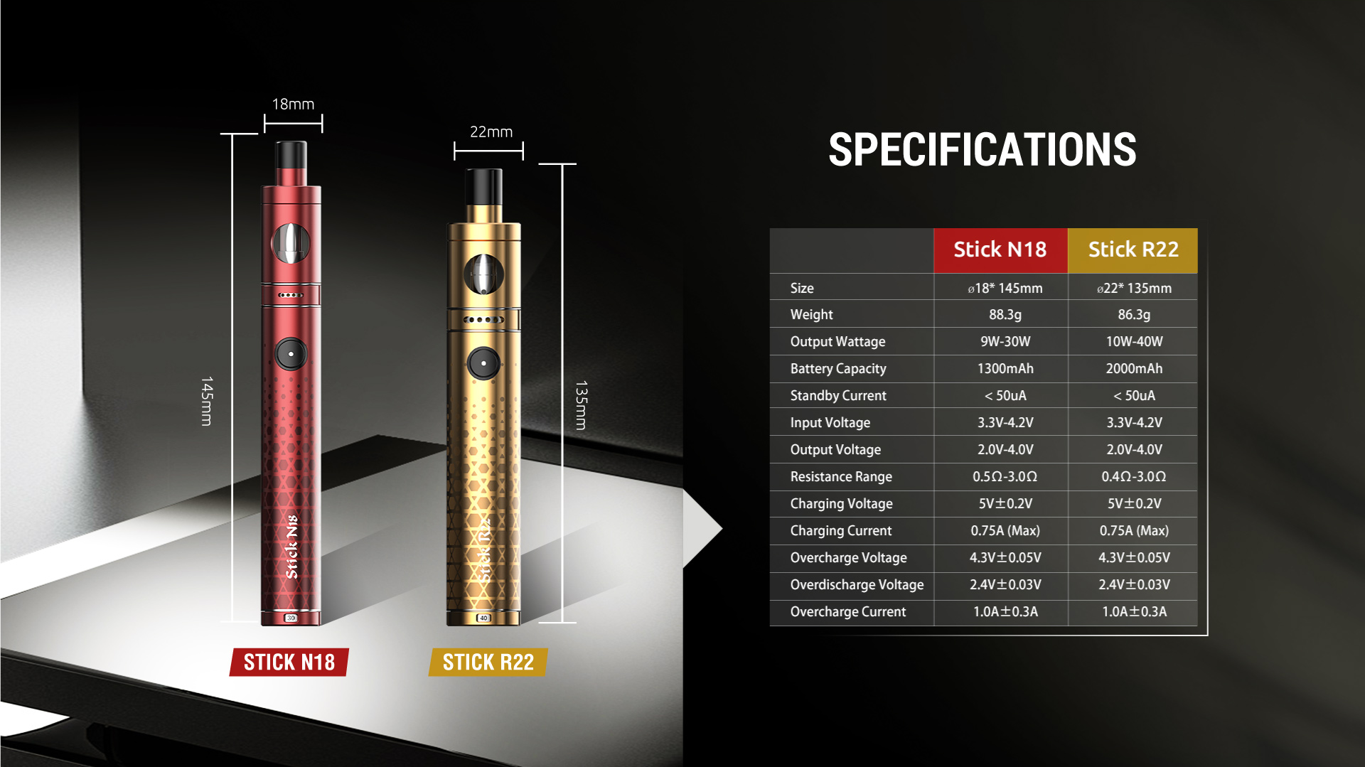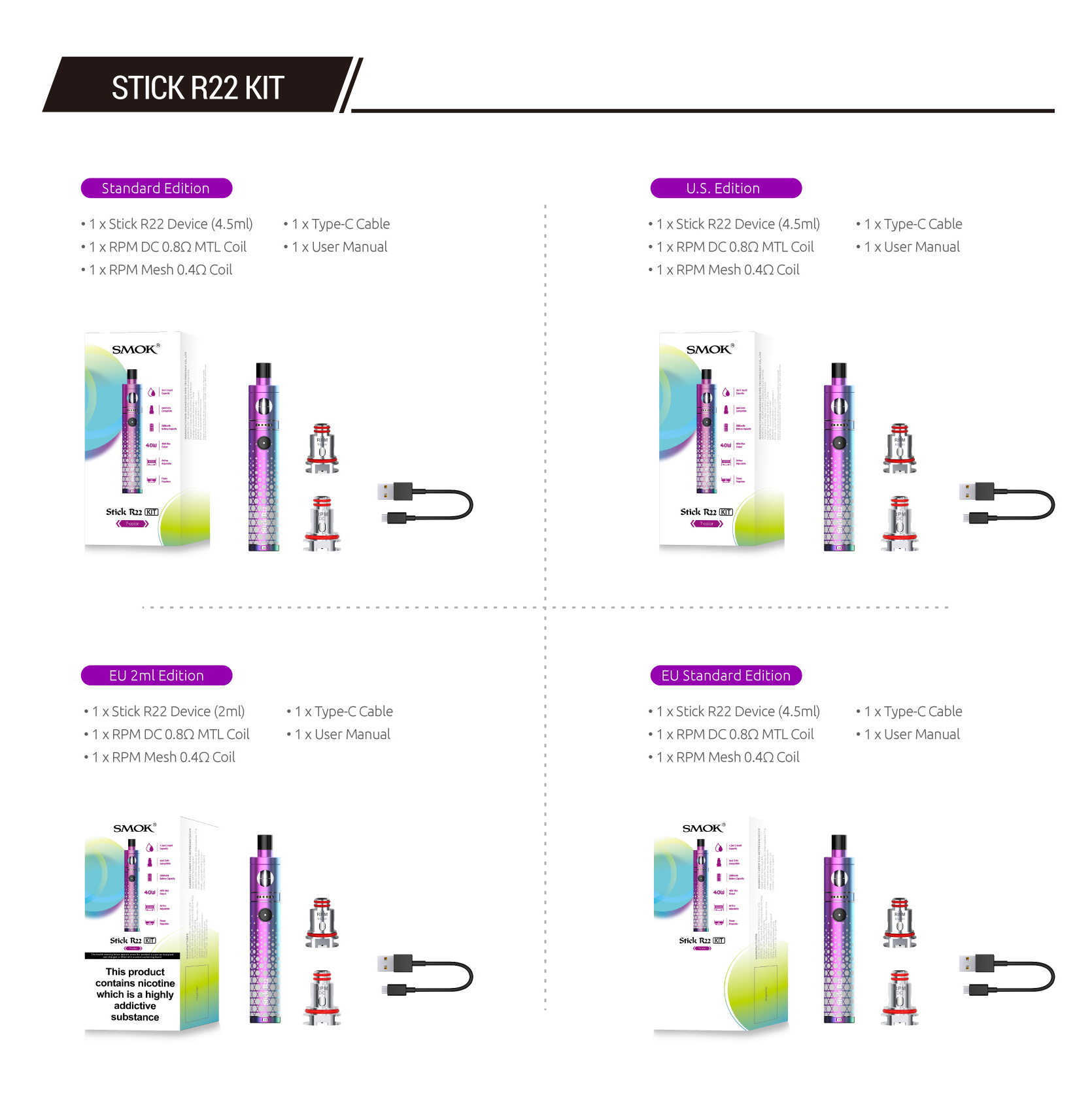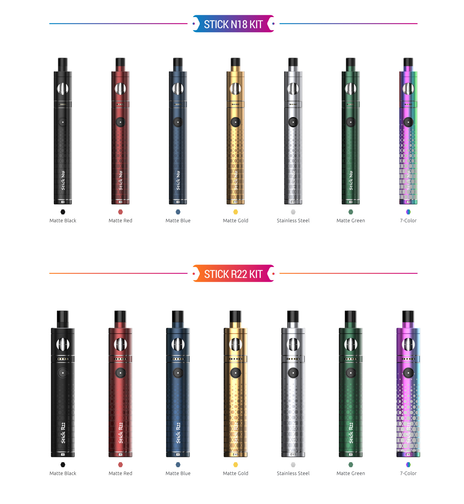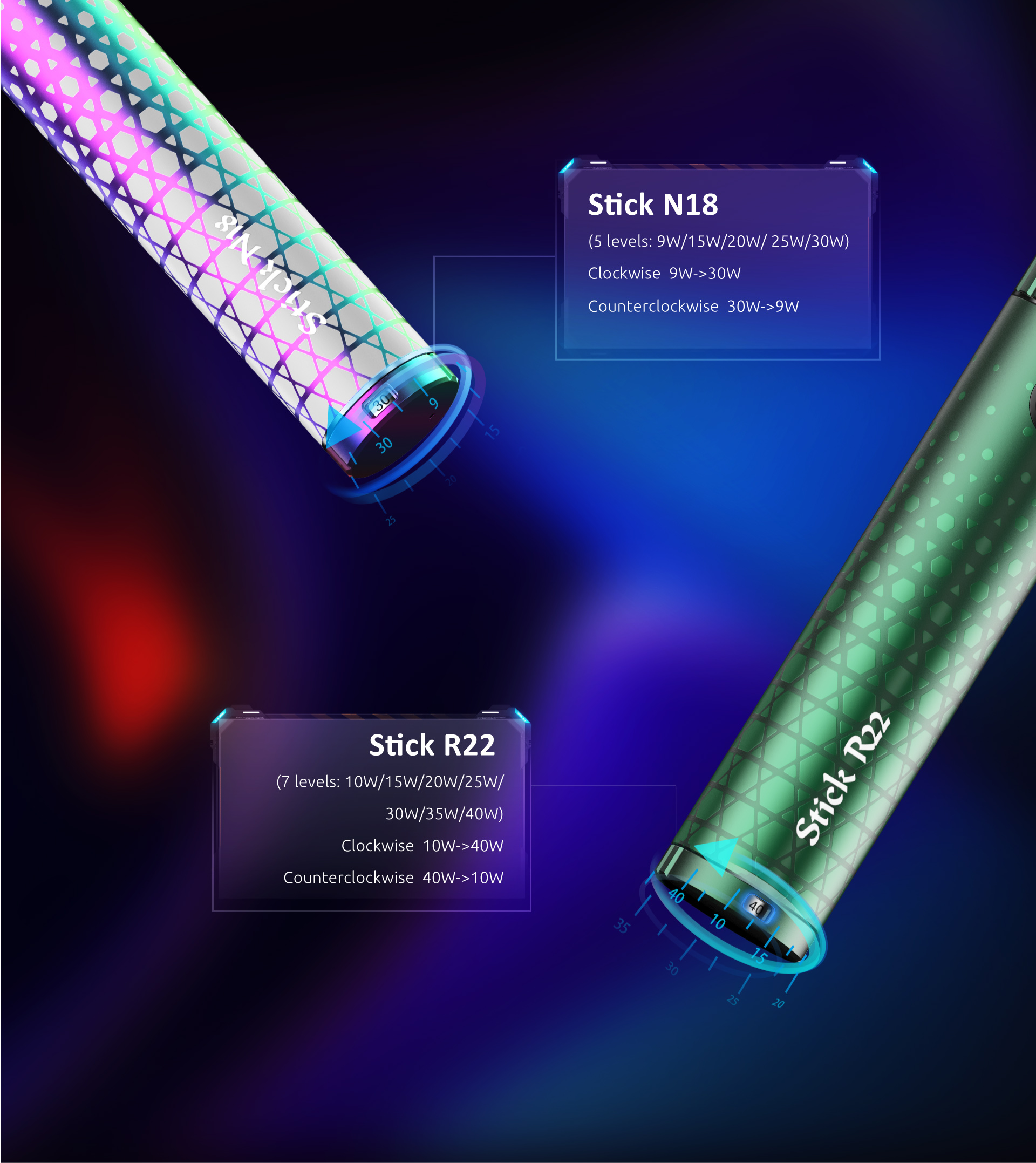 SMOK Stick R22 est un appareil de vape de style stylo AIO qui utilise des bobines SMOK RPM. Il dispose d'une fonction de puissance variable à 6 niveaux et d'un débit d'air réglable. Il y a un régulateur de puissance à la base de l'appareil pour vous fournir des valeurs de watt à plusieurs niveaux pour un ajustement plus ciblé. 7 niveaux de puissance de sortie sont disponibles pour vous de régler : 10W/15W/20W/25W/30W/35W/40W. En outre, il y a aussi une bague de contrôle d'air en haut de l'appareil pour que vous puissiez régler le flux d'air pour obtenir le goût souhaité. Stick R22 a une capacité de batterie de 2000mAh avec une plage de sortie de 10W-40W. Vous pouvez le charger à tout moment avec la conception de charge de type c. Avec un réservoir en verre intégré d'une capacité de 4,5 ml de jus électronique, il vous est facile de voir le niveau de jus électronique.