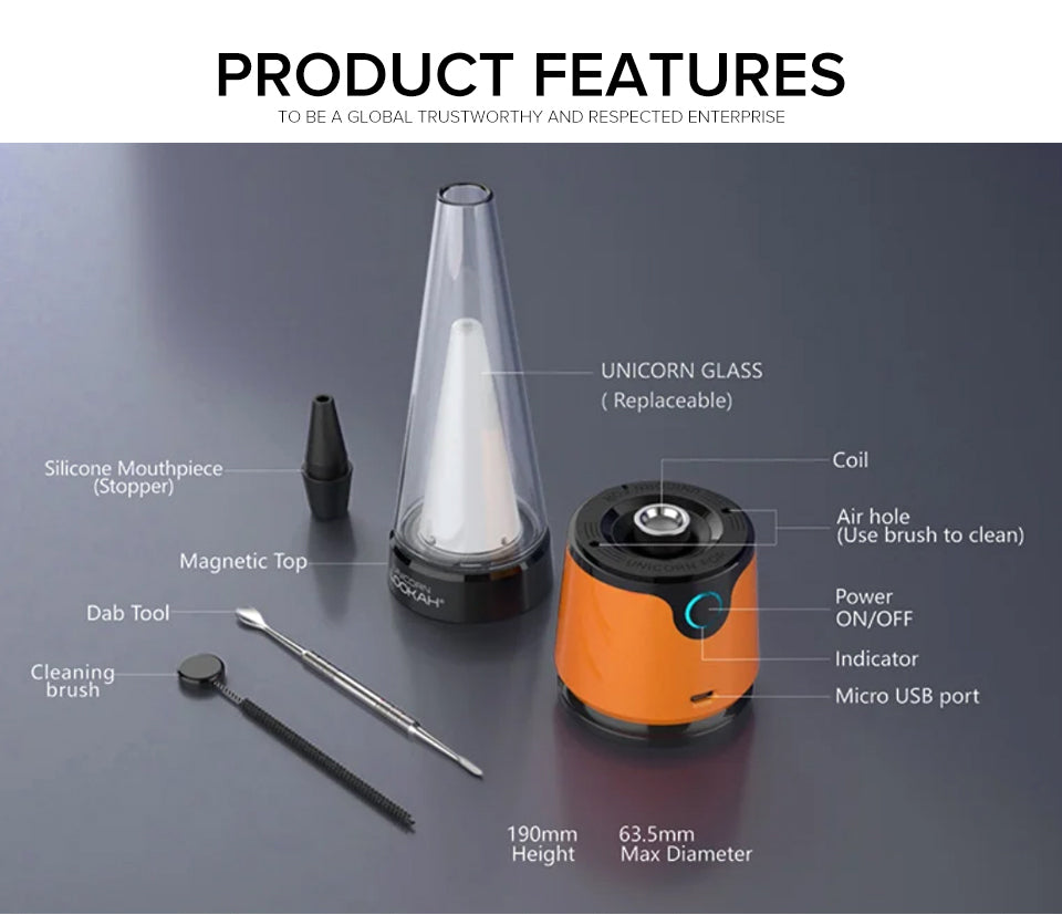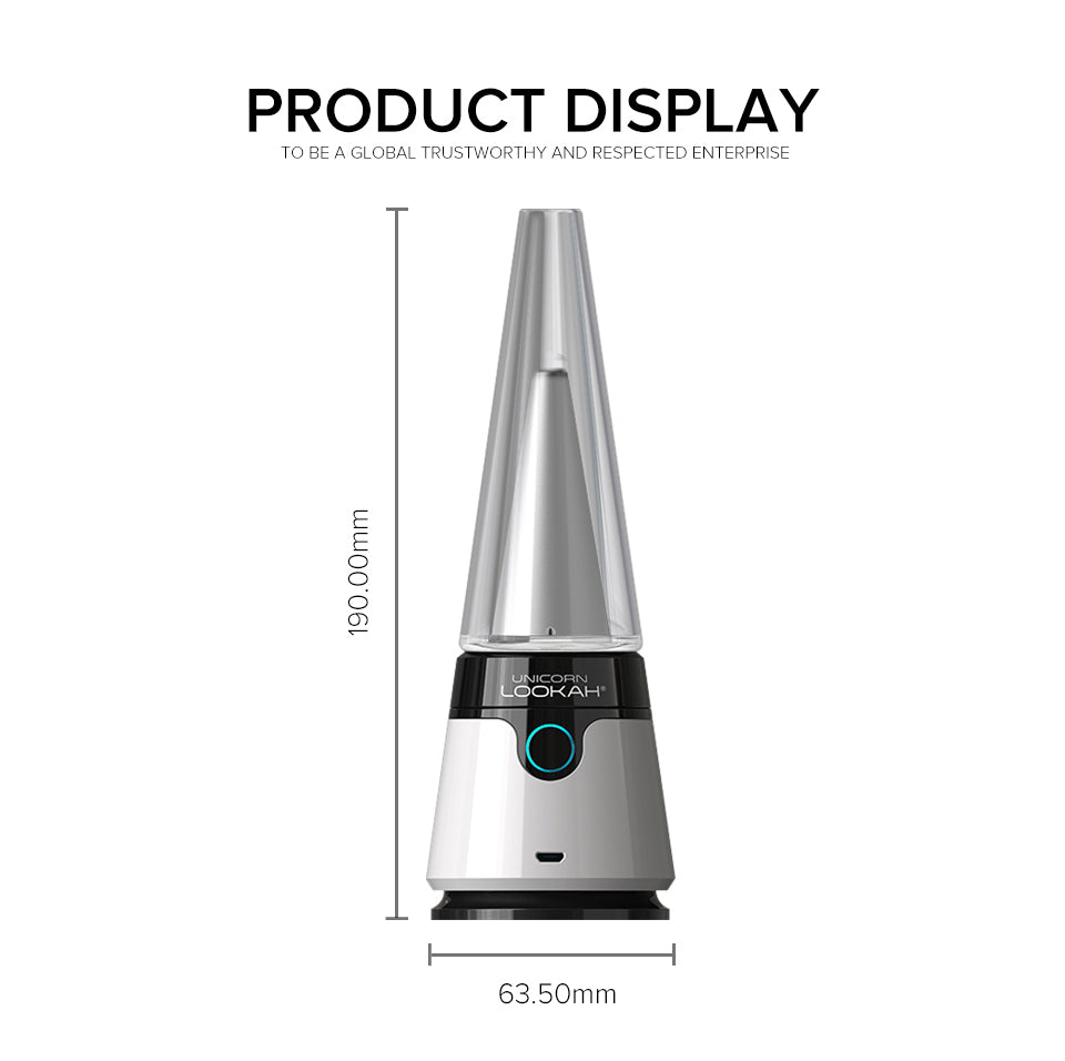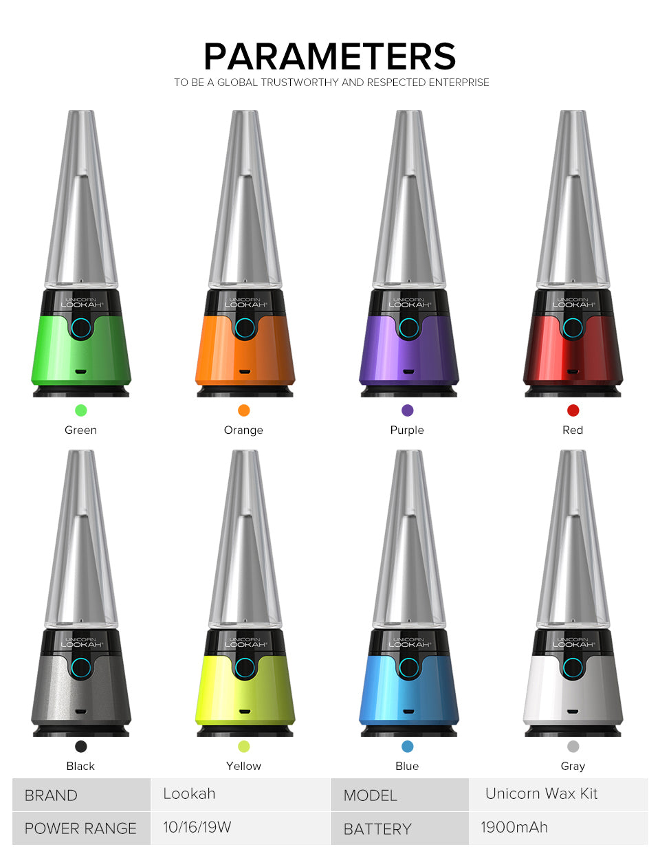 Kit Unicorn Lookah est un appareil de tamponnage électrique portable qui constitue l'expérience la plus efficace et la plus agréable. Il a été conçu et développé en interne avec un atomiseur révolutionnaire et une connexion magnétique. Un percolateur à connexion rapide avec deux voies de vapeur directes depuis l'atomiseur de quartz maintient un bon airflow pour un vapotage plus complet. Le haut et le bas de la Licorne sont maintenus en place par un puissant aimant, ce qui constitue une solution pratique et élégante pour charger la tasse. Le bang en verre filtre la vapeur, vous permettant de faire des déchirures massives. Un embout buccal en silicone aide à prévenir les déversements du percolateur en verre. L'e-rig utilise un noyau de quartz poreux dans une tasse en céramique, ce qui permet de chauffer rapidement et d'obtenir la saveur la plus pure ; par rapport au processus de chauffage et de refroidissement de 3 minutes avec un appareil de tamponnage traditionnel et une torche, l'e-rig Unicorn chauffe en quelques secondes. Il conserve également un goût pur, de sorte que vous ne perdez pas de terpènes et de flavonoïdes ; le résultat est une vapeur riche et pleine de saveur à chaque coup. L'efficacité supérieure de l'atomiseur à noyau de quartz tire le meilleur parti de la batterie de 1900mAh. Cela vous permet de prendre des charges de tampon à partir d'une charge complète. Avec trois résistances réparties uniformément sur le noyau, la distribution uniforme de la chaleur assure une bonne vaporisation de votre concentré, maximisant la vapeur produite. Et la rétroaction haptique maintient le timing sur le point, vous alertant lorsque les cycles de préchauffage et de chauffage automatique sont prêts, assurant un coup parfait. L'appareil s'allume en appuyant cinq (5) fois de suite sur le bouton de mise en marche. De là, il est facile de régler la température d'un double clic, en passant par les modes de température basse 3,3 V (vert), moyenne 3,6 V (bleu) et haute 4,2 V (blanc). Trois clics déclenchent le préchauffage et un mode automatique, indiqué par une LED clignotante et deux (2) vibrations. Une fois chauffé à la température réglée, vous pouvez profiter d'un tamponnage pouvant aller jusqu'à 60 %.