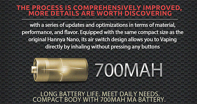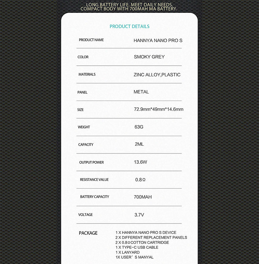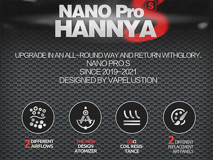 Le kit Vapelustion Hannya Nano Pro S est alimenté par une batterie intégrée de 700 mAh avec une puissance de sortie de 13,6 W et une charge USB Type-C. Il dispose d'une capacité de 2 ml de jus électronique, d'une résistance de bobine de 0,8 Ω et de 2 flux d'air différents. Le kit Hannya Nano Pro S dispose également de 2 panneaux de remplacement différents avec une conception de panneau métallique.