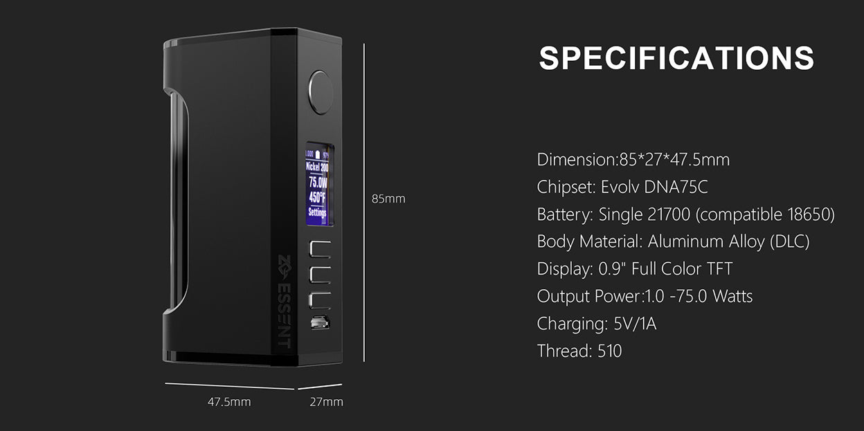 C'est le mod box le plus ergonomique conçu pour avoir une prise ferme et le rendre confortable dans la paume de votre main. Les bords arrondis font du mod le meilleur et construit avec un alliage d'aluminium de haute qualité avec la forme confortable que vous soyez le pouce ou le doigt. Le ZQ Essent Mod est alimenté par une seule batterie 21700 et peut être compatible avec des batteries 18650 à l'aide de l'adaptateur 18650 inclus. Les batteries 21700/18650 sont scellées avec le style de portes télescopiques, ce qui les rend plus durables et durera longtemps. Et utilisez le chipset DNA 75c le plus avancé et le plus personnalisable conçu par EVOLV. Avec une efficacité de batterie de 89% supérieure à celle des autres. Le chipset DNA 75c peut fournir des fonctions riches pour chaque utilisateur, prendre en charge VW / TC / TCR / VV et d'autres modes, et peut utiliser la fonction de relecture, qui peut imiter et répéter les actions précédentes. À l'aide du logiciel Escribe, vous pouvez facilement effectuer tous les réglages à la maison sur votre PC. L'appareil est équipé d'un grand écran TFT couleur de 0,9 pouces pour rendre tous les paramètres clairement visibles. De plus, le haut du ZQ Essent Mod utilise une connexion 510 pouvant accueillir des atomiseurs jusqu'à 26 mm sans surplomb. L'esthétique et les performances globales sont de premier ordre.