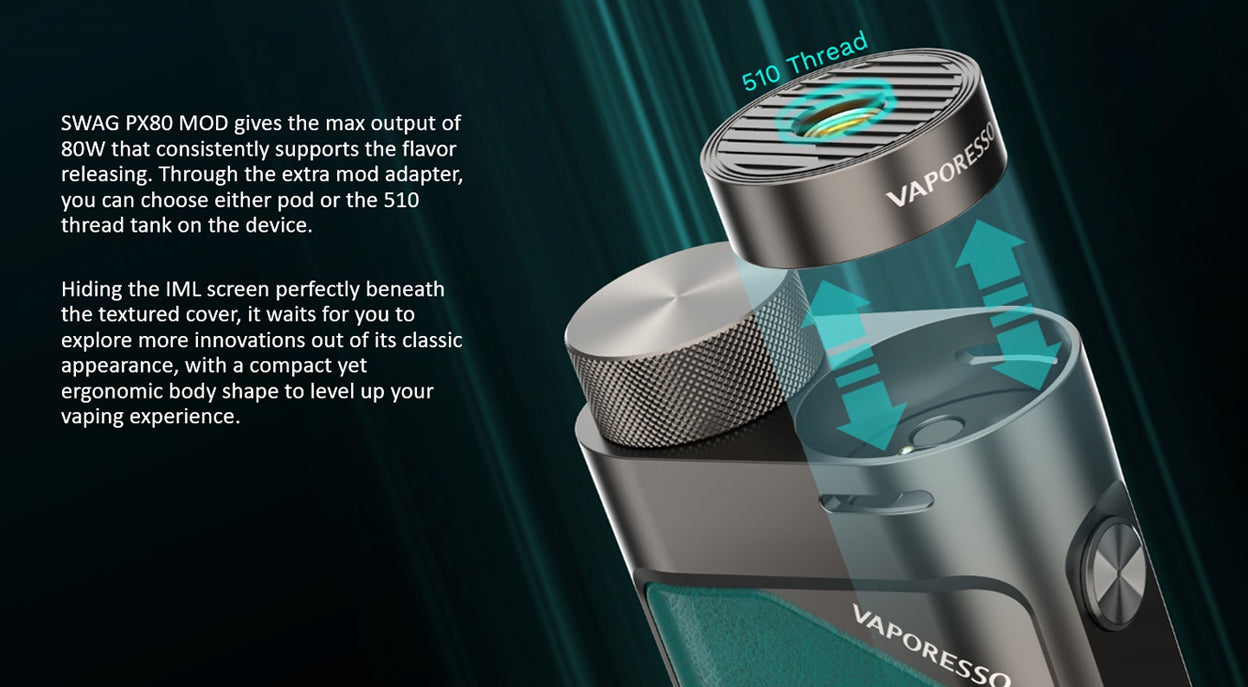 Le Mod Swag PX80 - Vaporesso est le plus compact des appareils 80W. Le Vaporesso Swag PX80 adopte un écran IML intégré, cachant parfaitement l'écran IML sous le couvercle texturé. Par une seule batterie 18650, le Vaporesso Swag PX80 tire 5-80W wattage réglable. Doté de l'AXON CHIP, le Swag PX80 peut être tiré en 0,001s. Vous pouvez utiliser le réservoir à filetage 510 sur l'appareil.